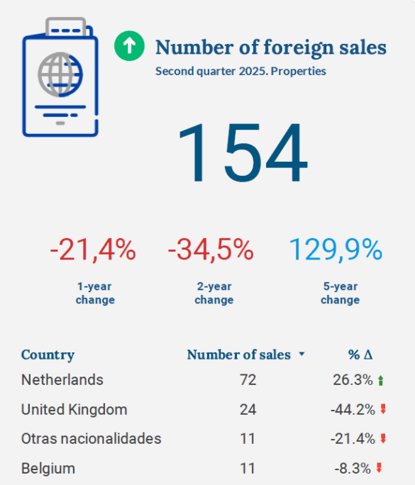 By nationality, buyers from the Netherlands stand out with 72 transactions, followed by the United Kingdom (24), while other nationalities and Belgium account for 11 transactions each. These figures reflect the importance of the international market, with a solid long-term base despite recent adjustments.