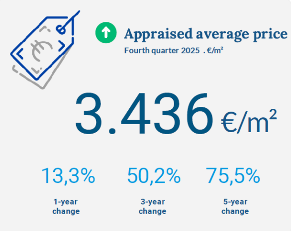 The average appraised price reached €3,436/m², representing a very significant year-on-year increase of 13.3%, along with a cumulative rise of 50.2% over three years and 75.5% over five years. Overall, these figures confirm the strength of Jávea’s market and its clear upward price trend.