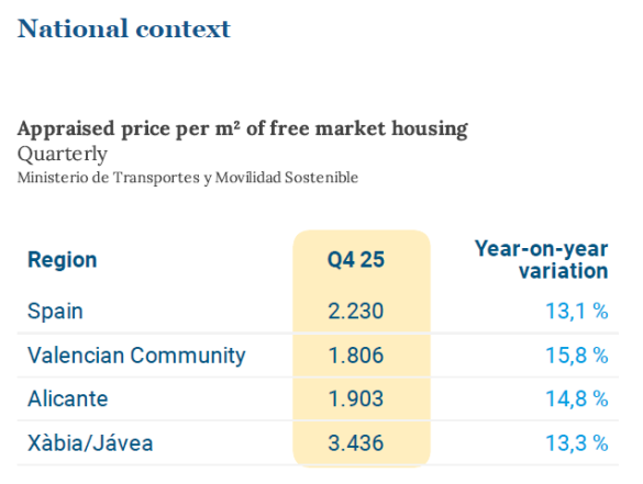 In terms of evolution, all areas show year-on-year increases, with notable rises ranging from 13.1% in Spain to 15.8% in the Valencian Community. Jávea records growth of 13.3%, confirming both the general market dynamism and its position as one of the areas with the highest prices.