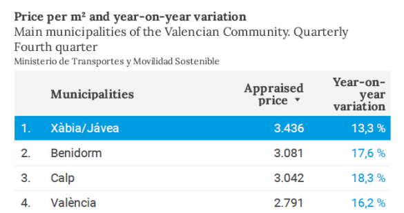 The data shows that Jávea ranks as the municipality with the highest price per square meter, reaching €3,436/m², confirming its strong appeal within the Valencian Community’s real estate market.