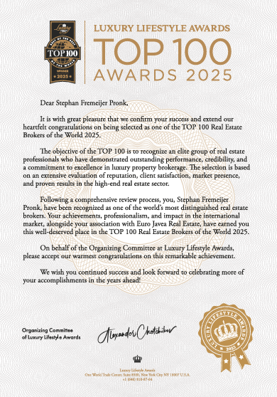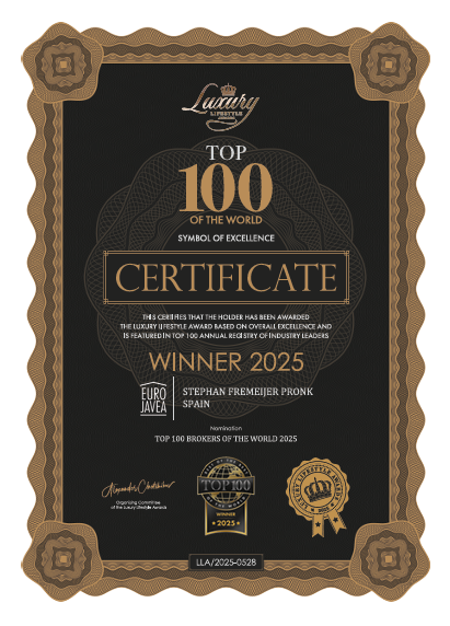 Tras un exhaustivo proceso de evaluación, Stephan Fremeijer Pronk ha sido reconocido como uno de los agentes inmobiliarios más destacados del mundo. Sus logros, su profesionalidad y su impacto en el mercado internacional, junto con su liderazgo en Eurojavea Real Estate, le han valido un merecido puesto en el “TOP 100 Real Estate Brokers of the World 2025″.
