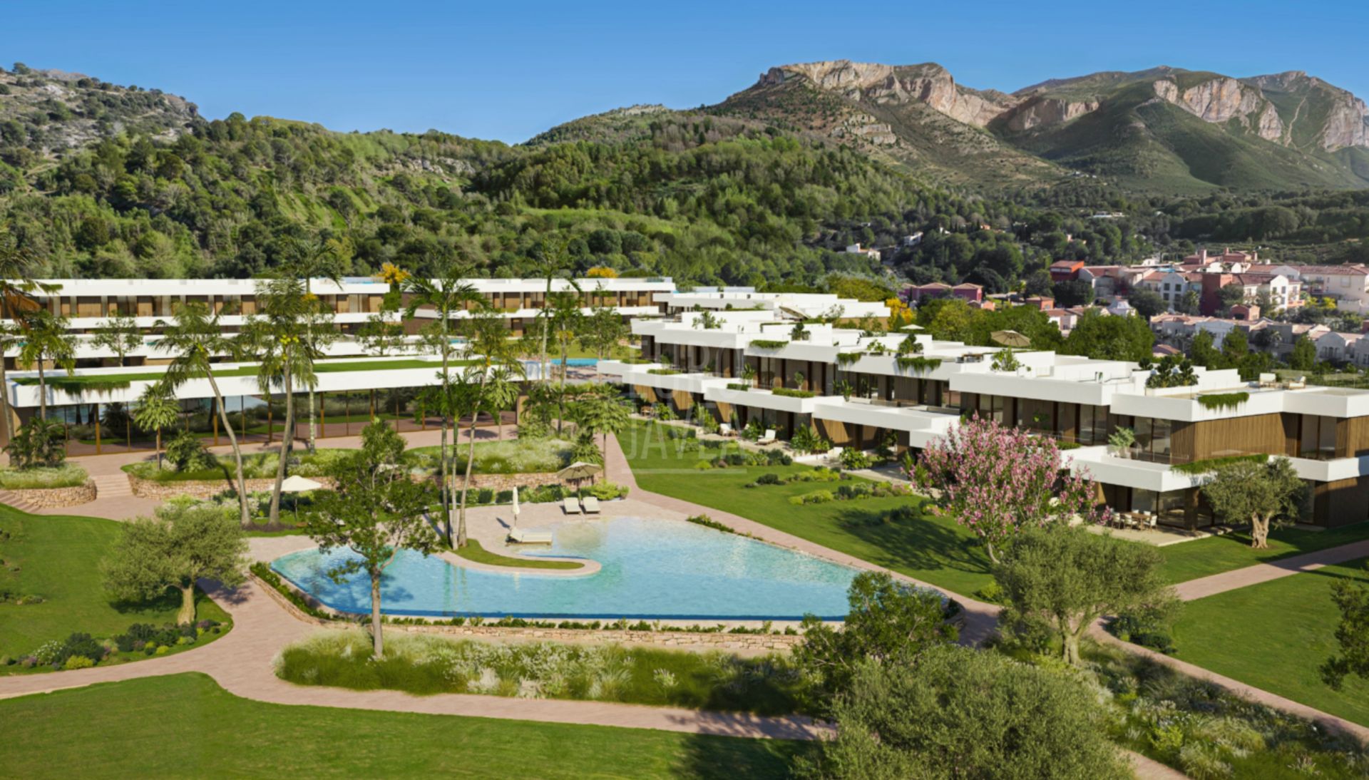 El complejo se ubica junto al reconocido campo de golf La Sella, considerado entre los mejores de la zona, y ofrece impresionantes vistas abiertas al Parque Natural del Montgó, creando un entorno único y especialmente atractivo para los amantes del golf y la tranquilidad.