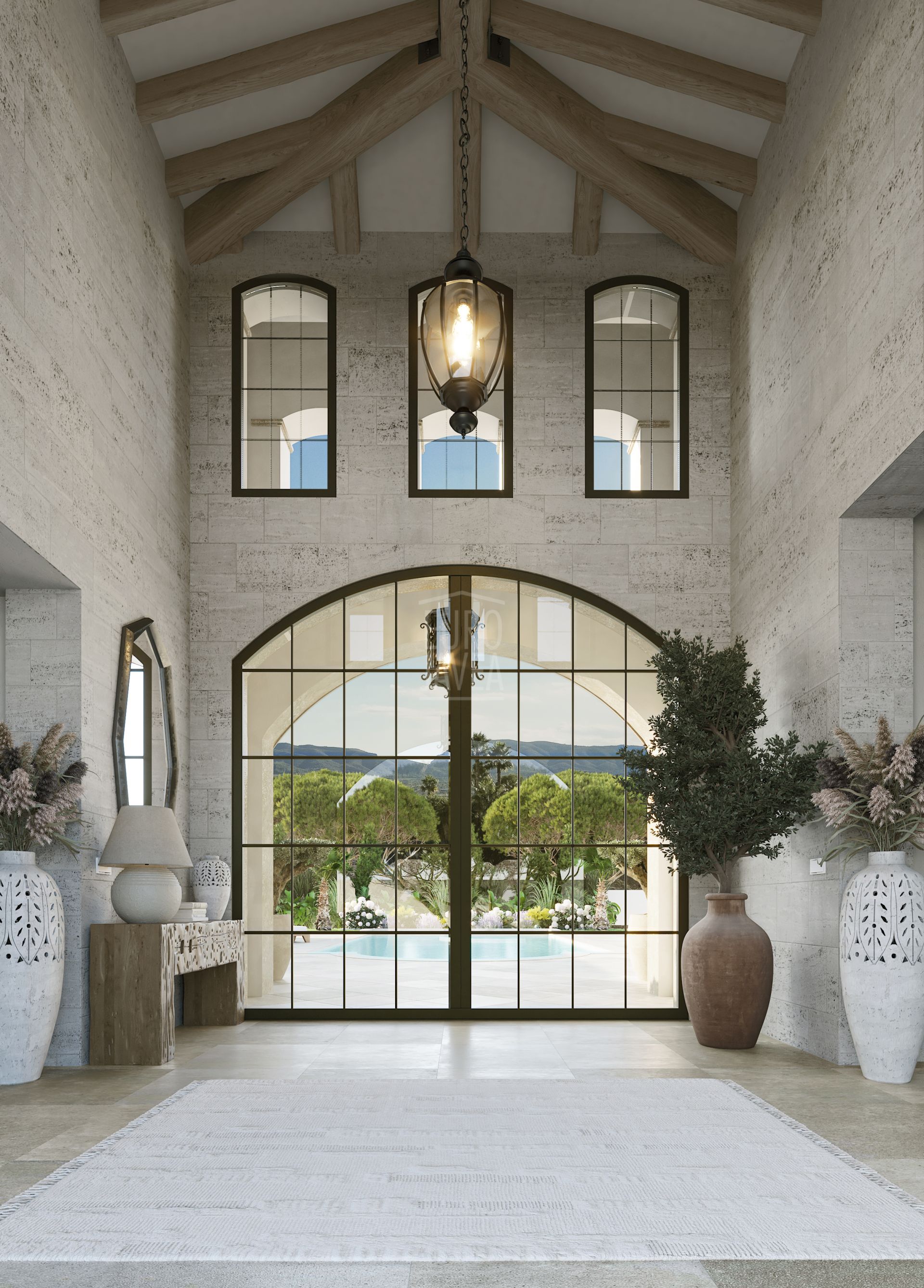 El diseño arquitectónico se inspira en el estilo mediterráneo con influencias coloniales, caracterizado por líneas elegantes, volúmenes equilibrados y cubiertas de teja tradicional. La vivienda se organiza en torno a un patio central con piscina, auténtico corazón de la casa, alrededor del cual se desarrollan amplias terrazas, jardines cuidadosamente diseñados y espacios exteriores pensados para disfrutarse durante todo el año.