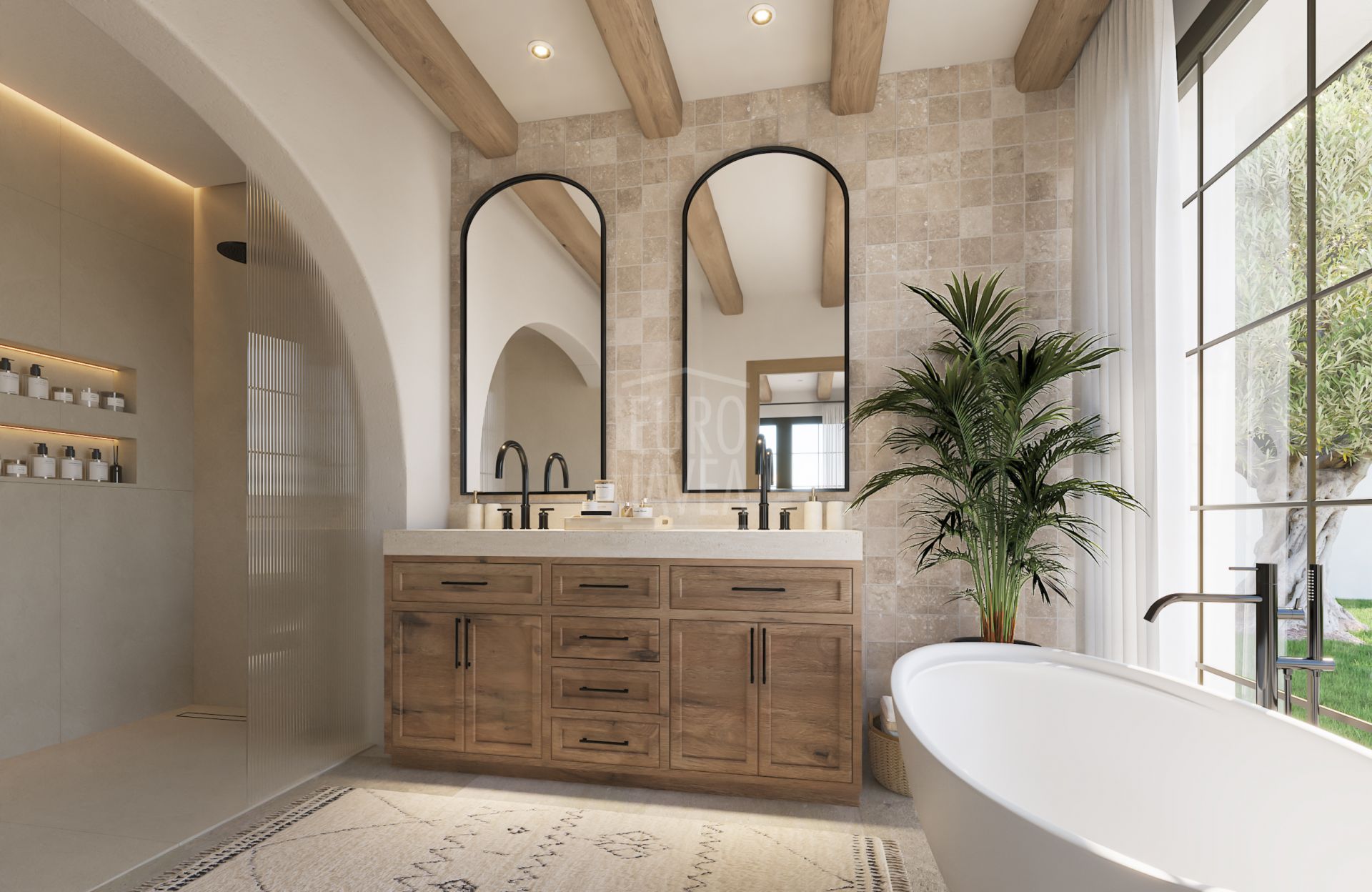 En el interior, la vivienda destaca por la calidad de sus materiales y la atención al detalle. Elementos como el mármol natural, los suelos de travertino, las vigas de madera maciza vistas y los muros de piedra trabajada a mano aportan carácter, calidez y una elegancia atemporal, integrándose perfectamente con el entorno.