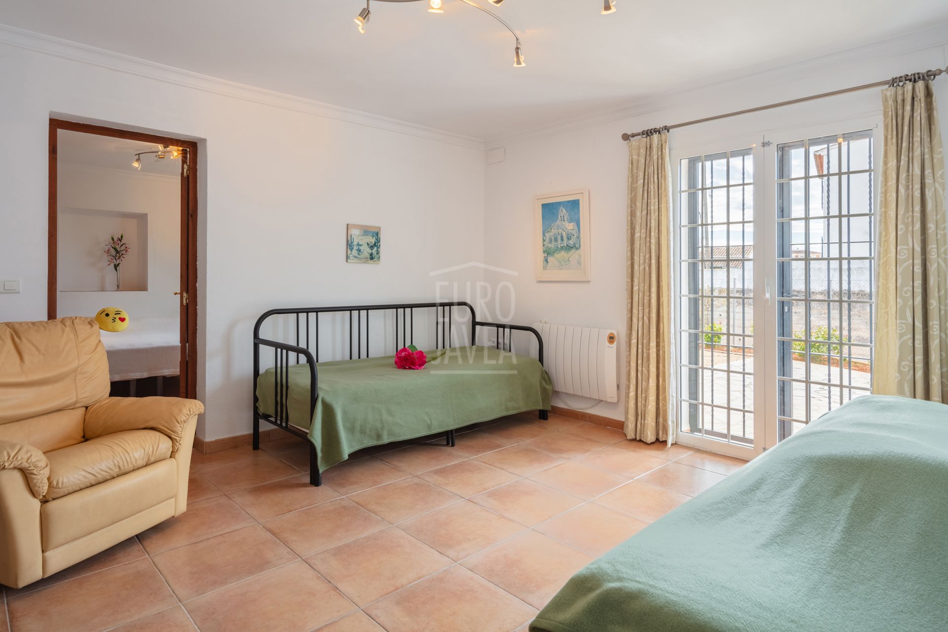 L'étage inférieur de la villa comprend un autre salon, parfait pour se détendre ou recevoir. Dans cette zone, il y a deux chambres spacieuses avec salles de bains attenantes, ainsi qu'une chambre supplémentaire, idéale pour les invités ou comme espace multifonctionnel.