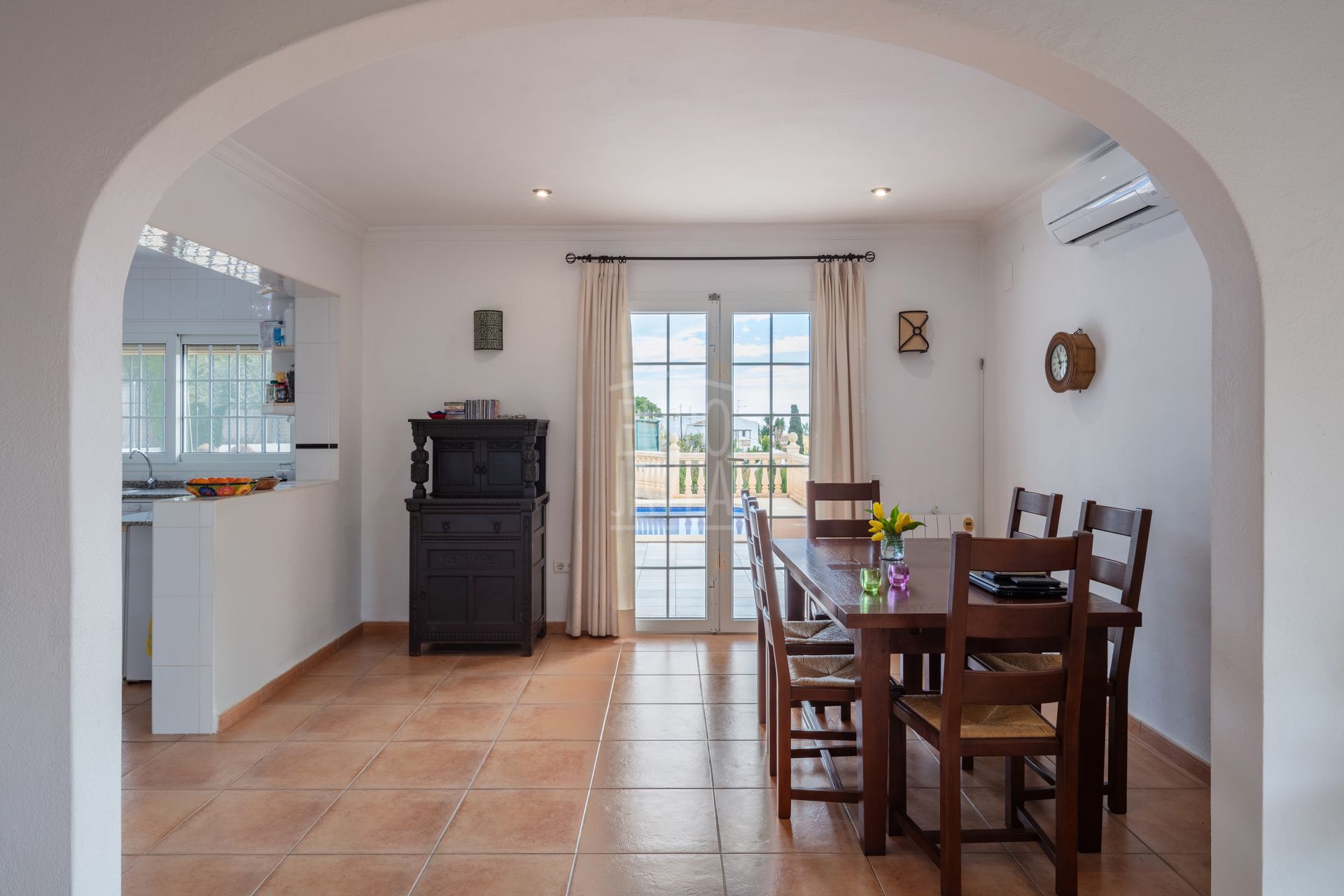 En entrant dans la villa, nous trouvons un hall spacieux qui nous guide vers le salon-salle à manger, accompagné d'une cuisine ouverte. L'espace donne sur la belle zone de la piscine avec des vues jusqu'à la mer.