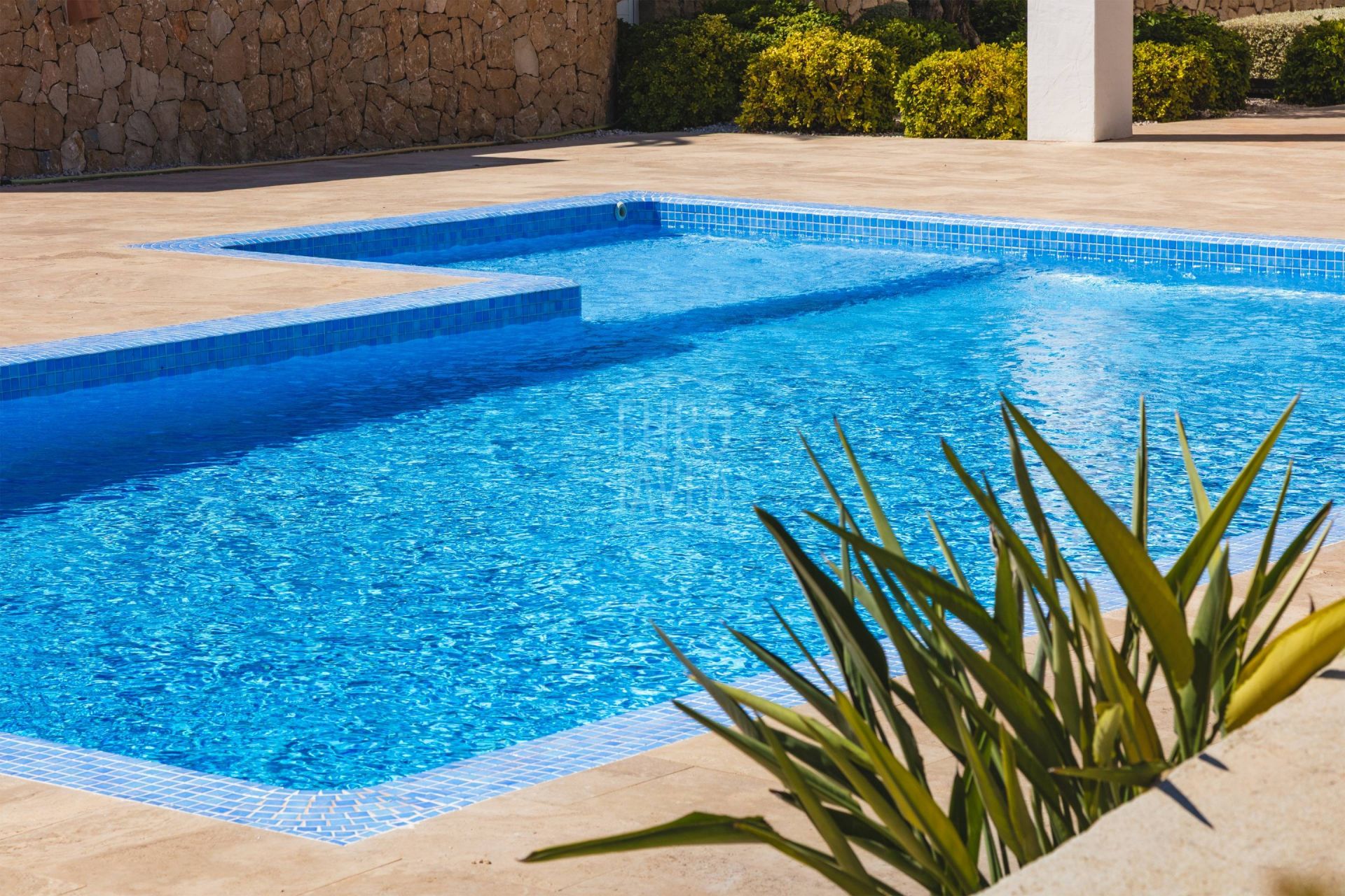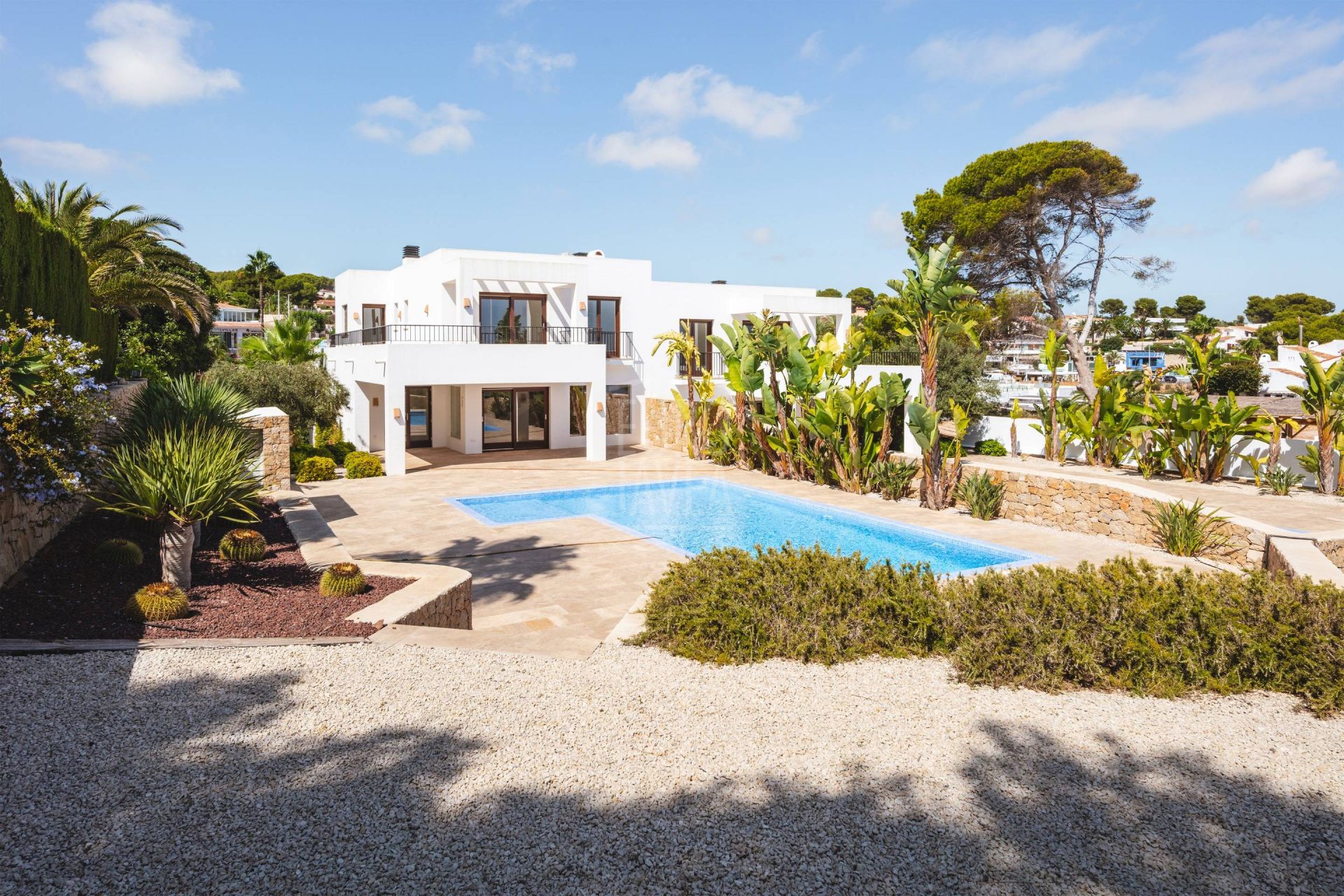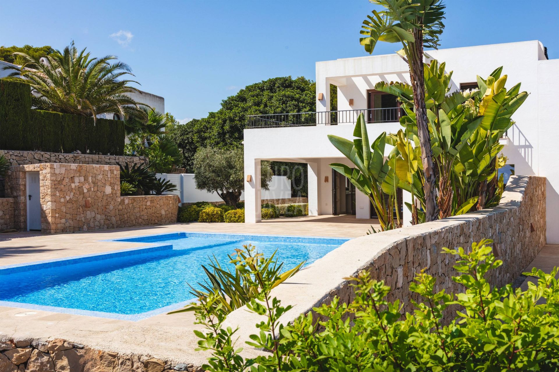 À l’extérieur, la grande piscine privée s’intègre parfaitement dans le paysage marin, entourée de jardins consolidés avec végétation locale et de terrasses en pierre naturelle. Les murs en pierre sèche ajoutent authenticité et harmonie avec l’environnement, créant des espaces conçus pour profiter du climat privilégié de Moraira toute l’année.