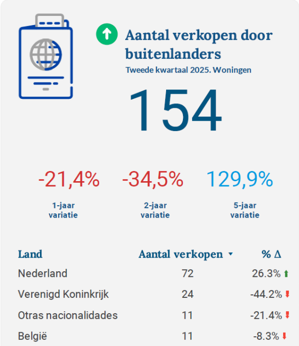 Per nationaliteit springen Nederlandse kopers eruit met 72 transacties, gevolgd door het Verenigd Koninkrijk (24), terwijl andere nationaliteiten en België elk 11 transacties vertegenwoordigen. Deze cijfers benadrukken het belang van de internationale markt, met een solide langetermijnbasis ondanks recente aanpassingen.