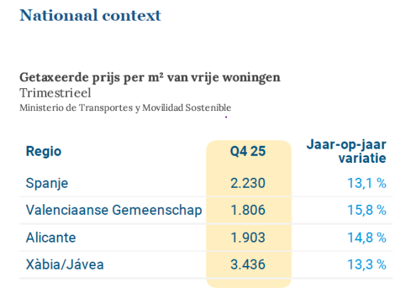 Wat de evolutie betreft, laten alle gebieden stijgingen op jaarbasis zien, met opvallende toenames variërend van 13,1% in Spanje tot 15,8% in de Comunidad Valenciana. Jávea noteert een groei van 13,3%, wat zowel de algemene marktdynamiek als haar positie als een van de gebieden met de hoogste prijzen bevestigt.