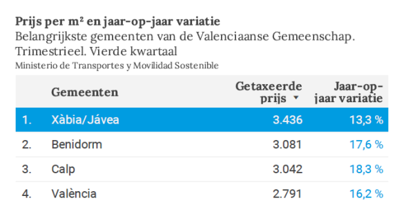 De gegevens tonen aan dat Jávea de gemeente is met de hoogste prijs per vierkante meter, met €3.436/m², wat haar sterke aantrekkingskracht binnen de vastgoedmarkt van de Comunidad Valenciana bevestigt.