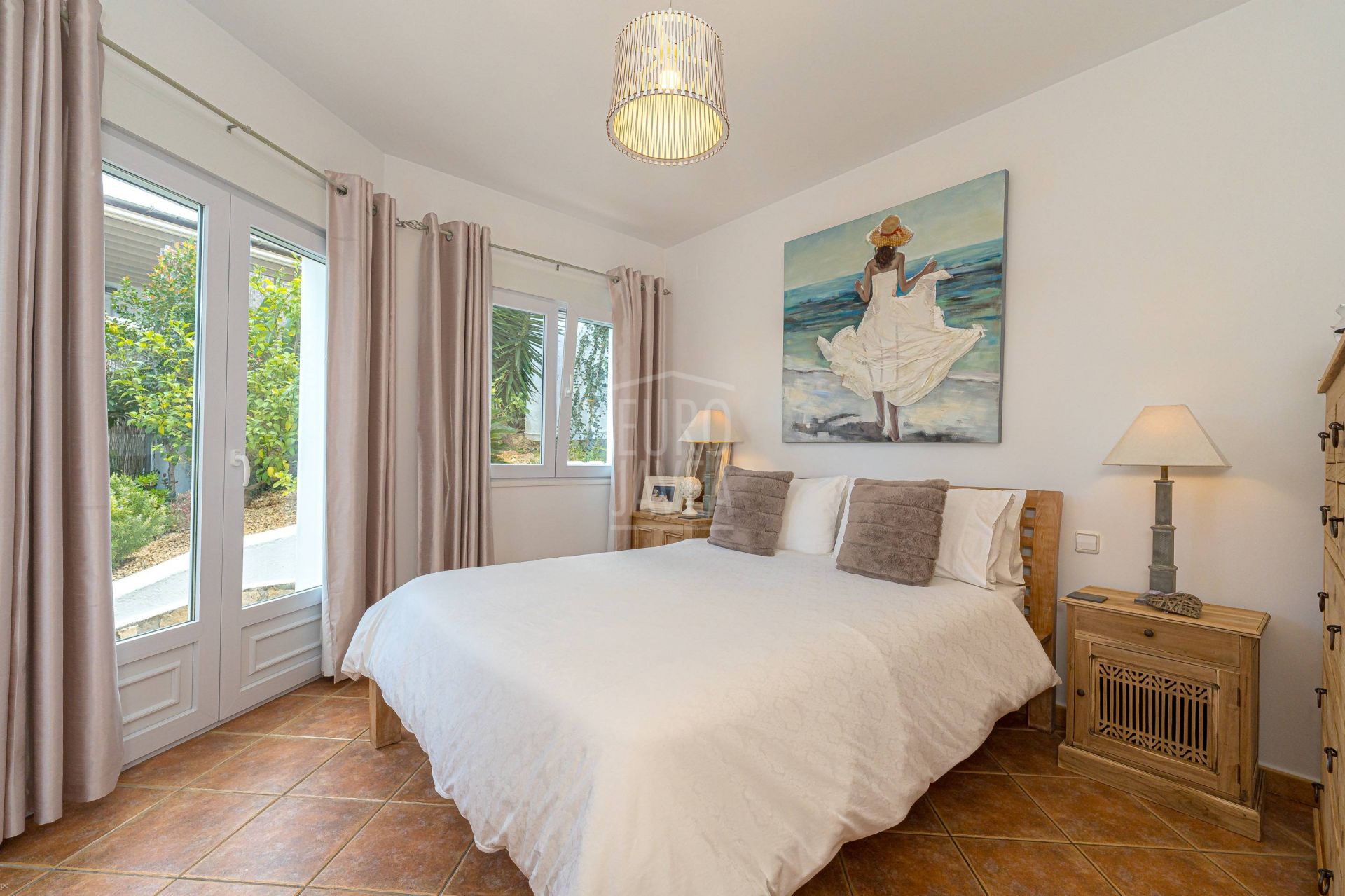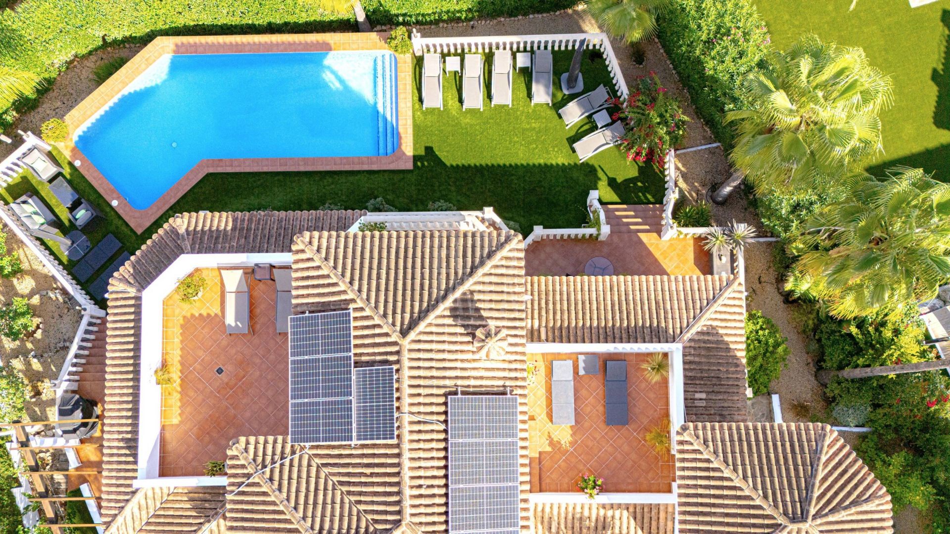 De onderhoudsvriendelijke tuin met volwassen mediterrane beplanting omringt de woning en biedt verschillende ontspanningsplekken. Het privézwembad, perfect op de zon georiënteerd, vormt het middelpunt van het buitenleven en biedt volledige privacy. Een afgesloten garage en extra parkeergelegenheid maken het geheel compleet.