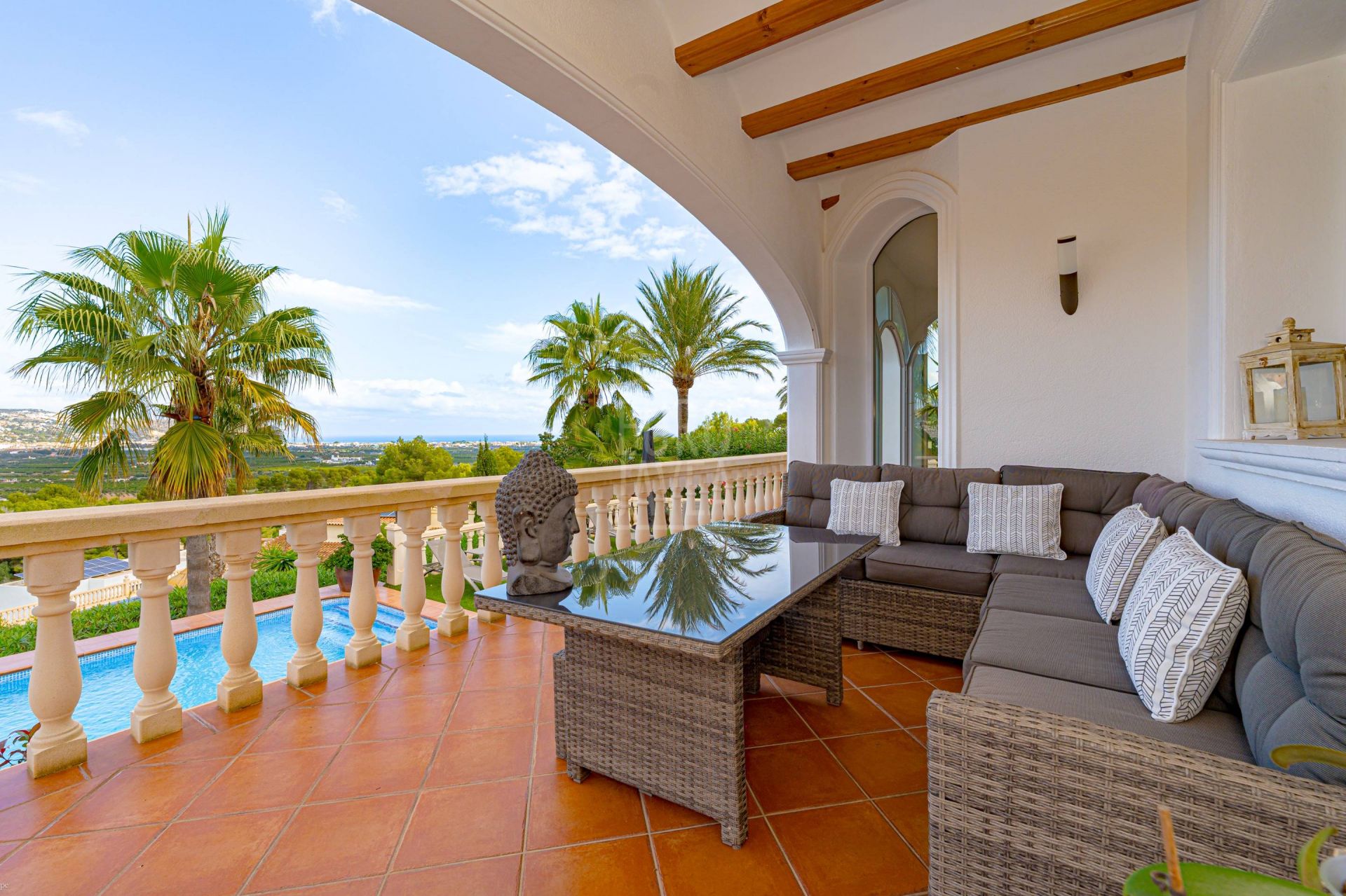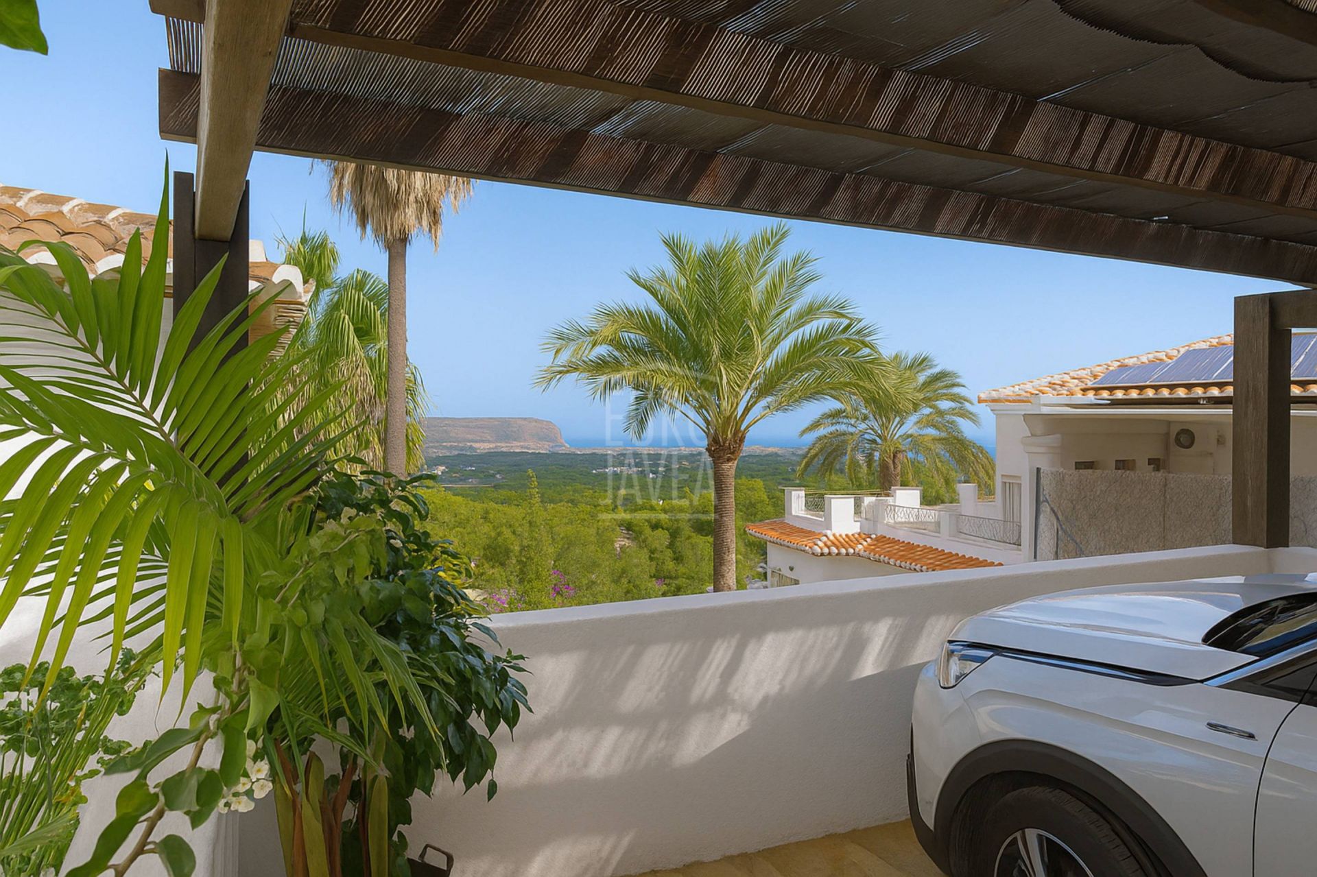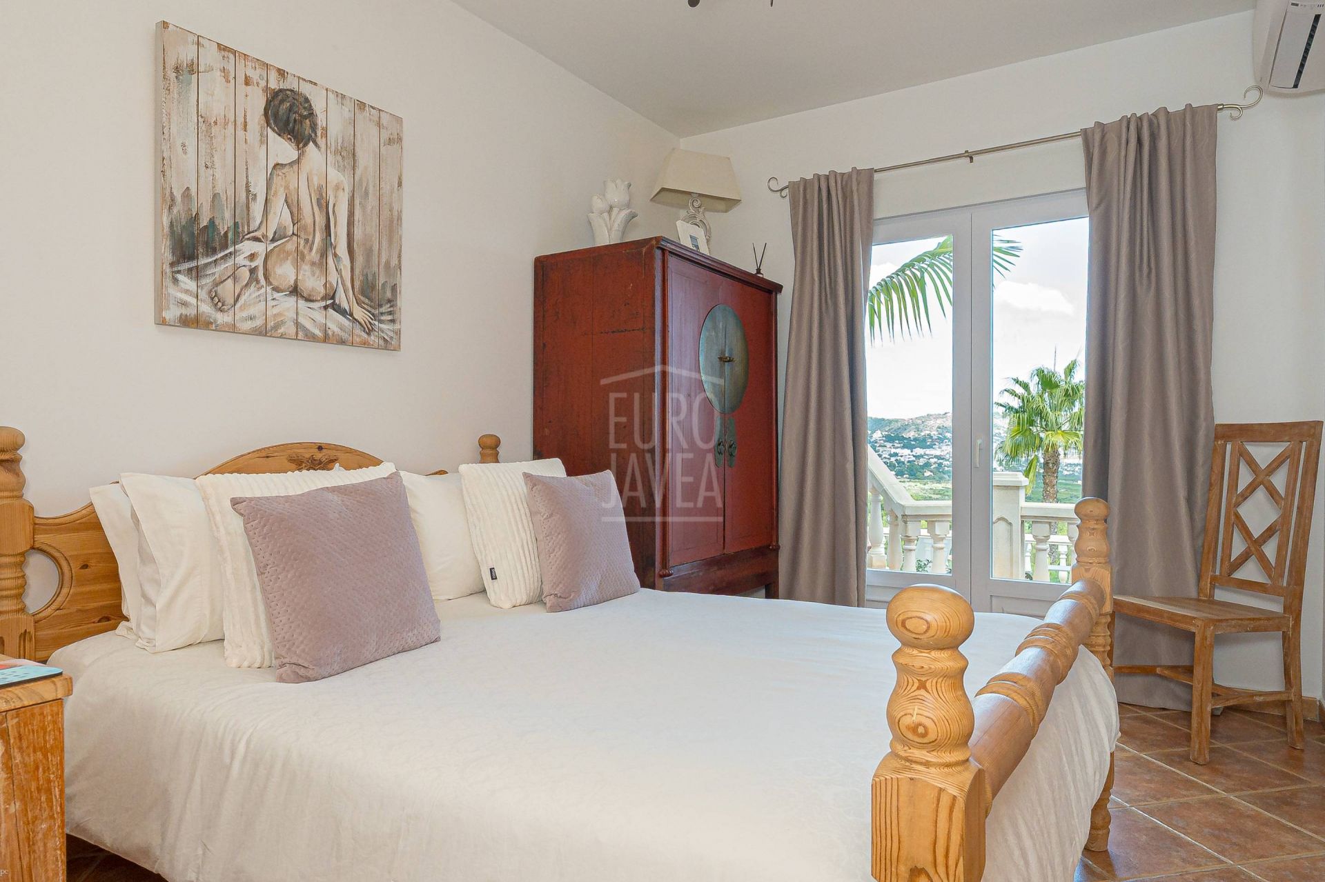 Dankzij de oriëntatie en indeling geniet men van open uitzichten op zee, de vallei en de Montgó, zowel vanaf de buitenruimtes als vanuit de belangrijkste woonvertrekken. De leefruimte loopt naadloos over in buiten: de woonkamer met natuurstenen open haard staat in directe verbinding met het terras en het zwembad, waardoor binnen en buiten één geheel vormen. De moderne, functionele keuken sluit aan op de eetkamer en de overdekte naya, ideaal voor lange avonden en zonsondergangen.