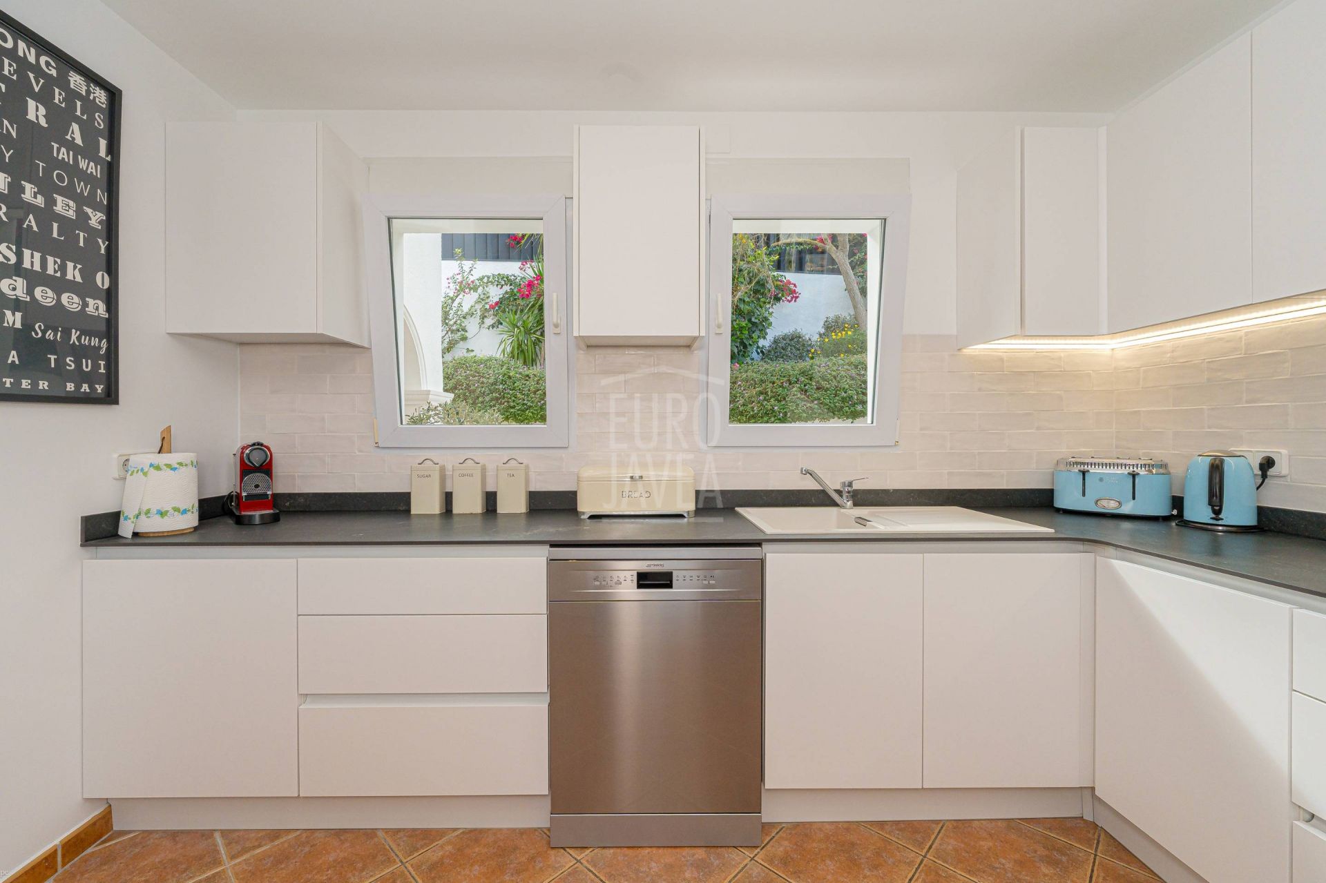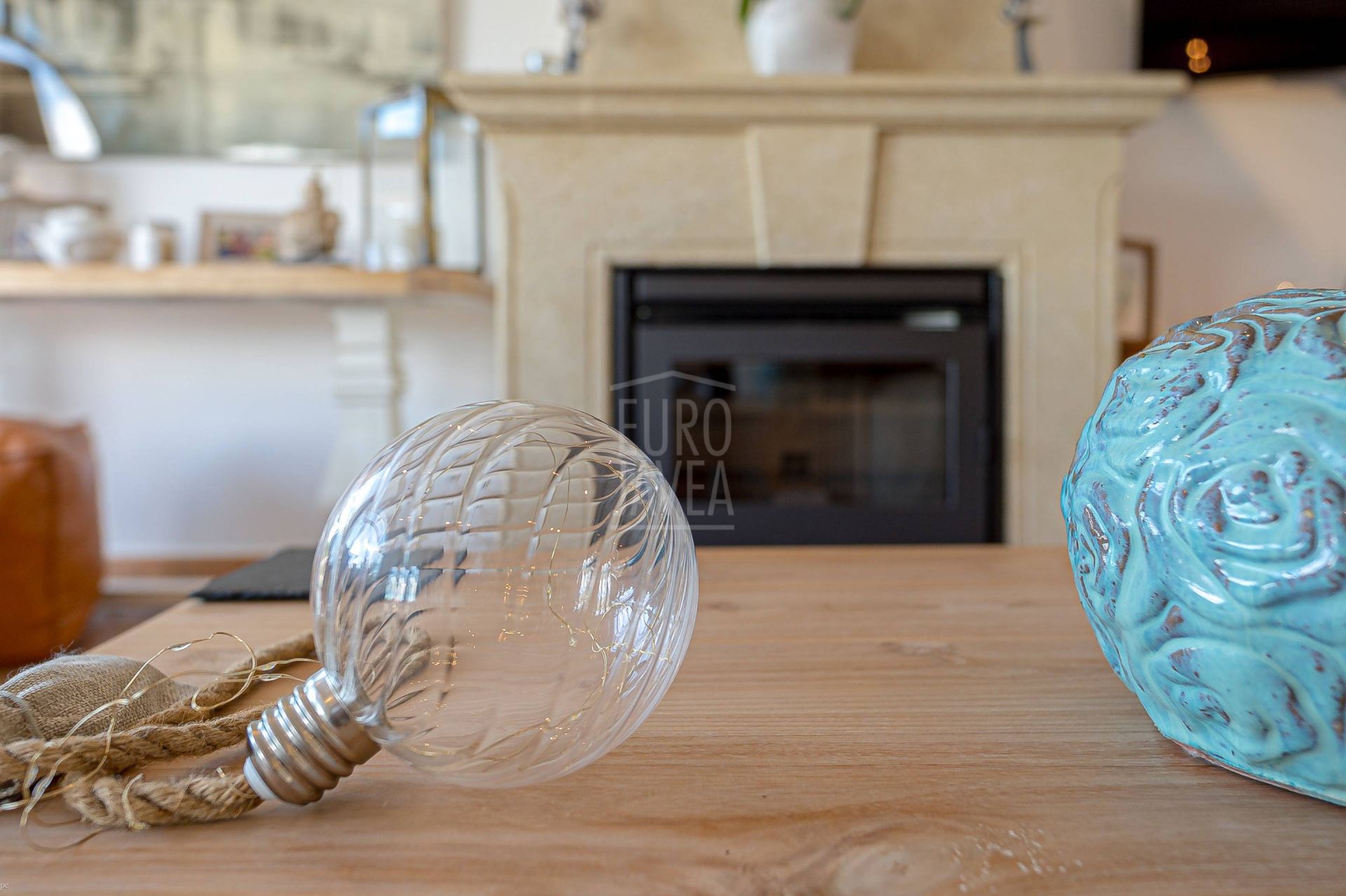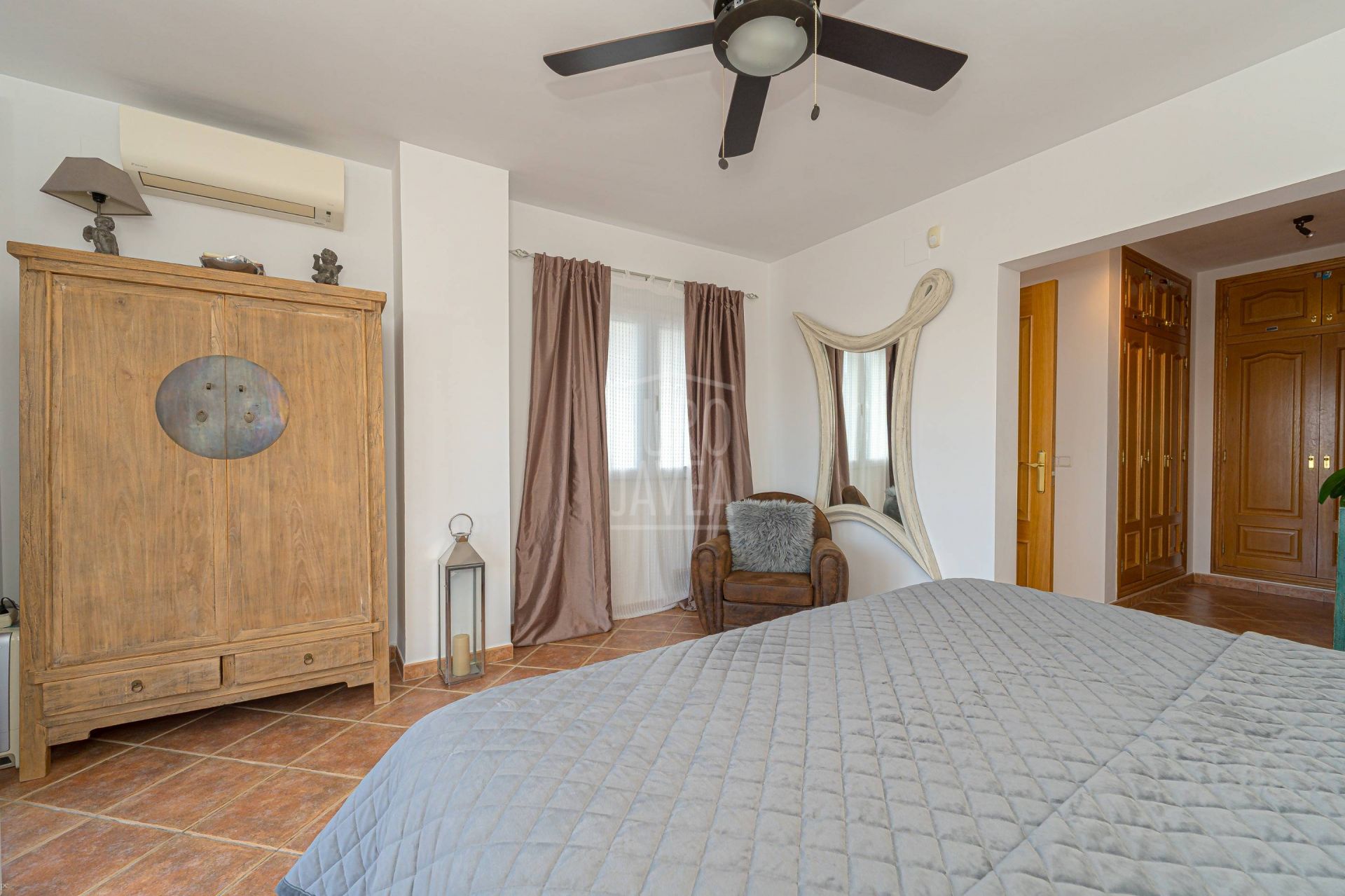 Dankzij de oriëntatie en indeling geniet men van open uitzichten op zee, de vallei en de Montgó, zowel vanaf de buitenruimtes als vanuit de belangrijkste woonvertrekken. De leefruimte loopt naadloos over in buiten: de woonkamer met natuurstenen open haard staat in directe verbinding met het terras en het zwembad, waardoor binnen en buiten één geheel vormen. De moderne, functionele keuken sluit aan op de eetkamer en de overdekte naya, ideaal voor lange avonden en zonsondergangen.