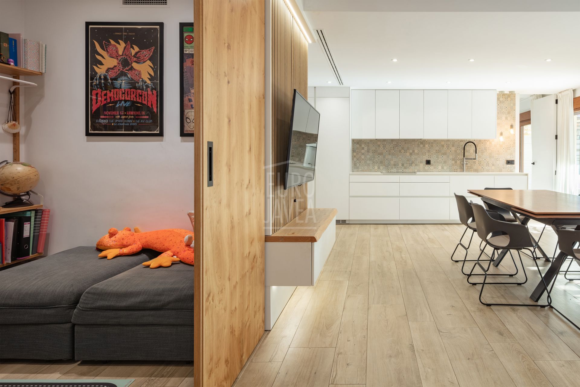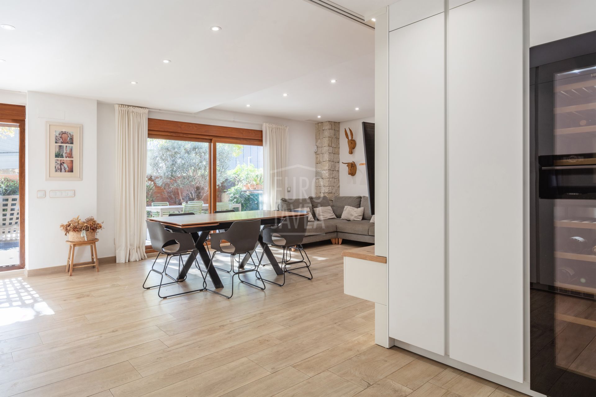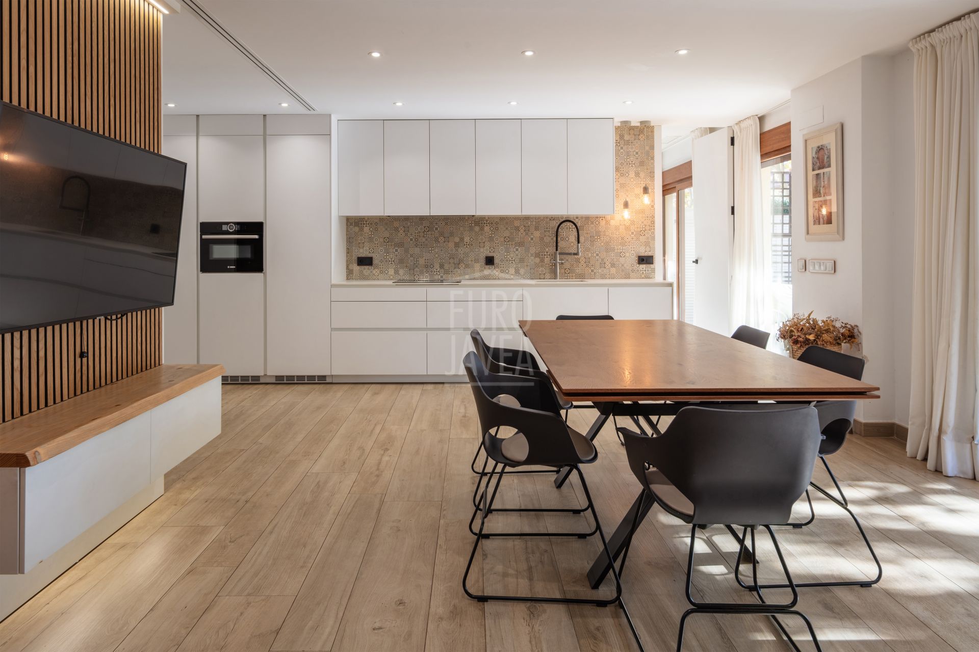 De woning is volledig gerenoveerd met hoogwaardige materialen en heeft een moderne en functionele uitstraling. Het beschikt over een ruime en lichte woon-eetkamer met een open keuken, volledig uitgerust en harmonieus geïntegreerd in de leefruimte. Een elegante ingebouwde wijnkast geeft het geheel een unieke en stijlvolle touch, perfect voor wijnliefhebbers.