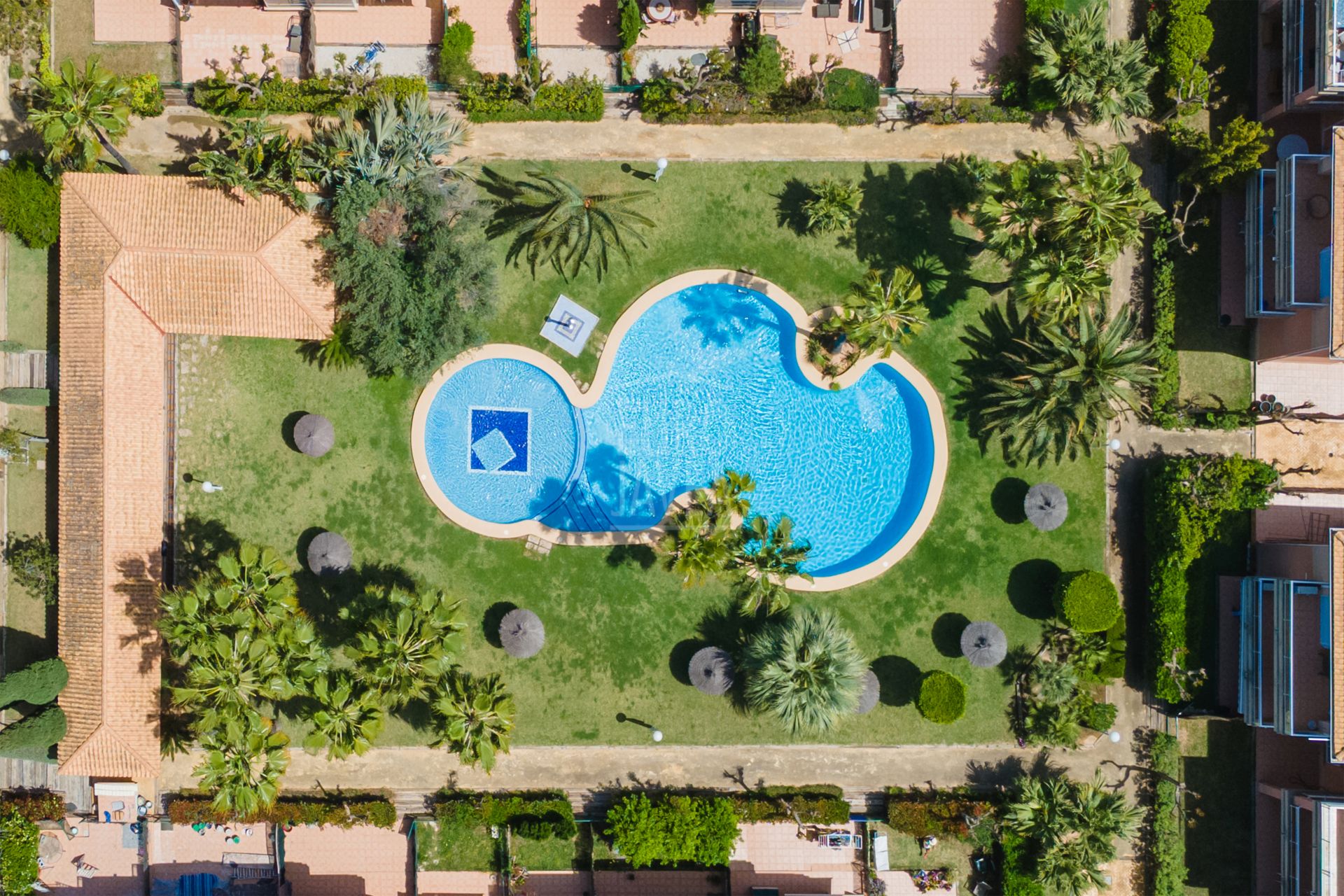 The residential complex boasts well-maintained gardens and two swimming pools, creating a private and relaxed environment, ideal for year-round enjoyment.
