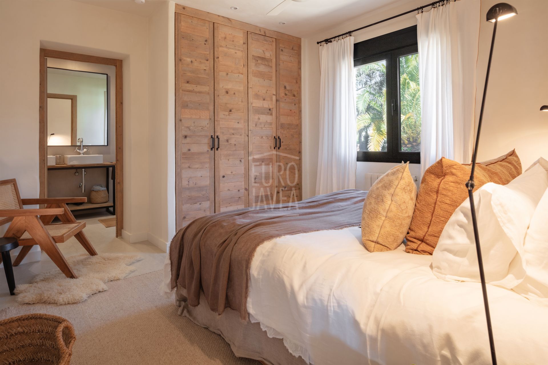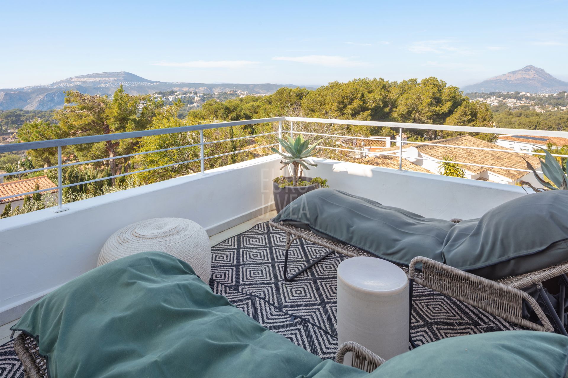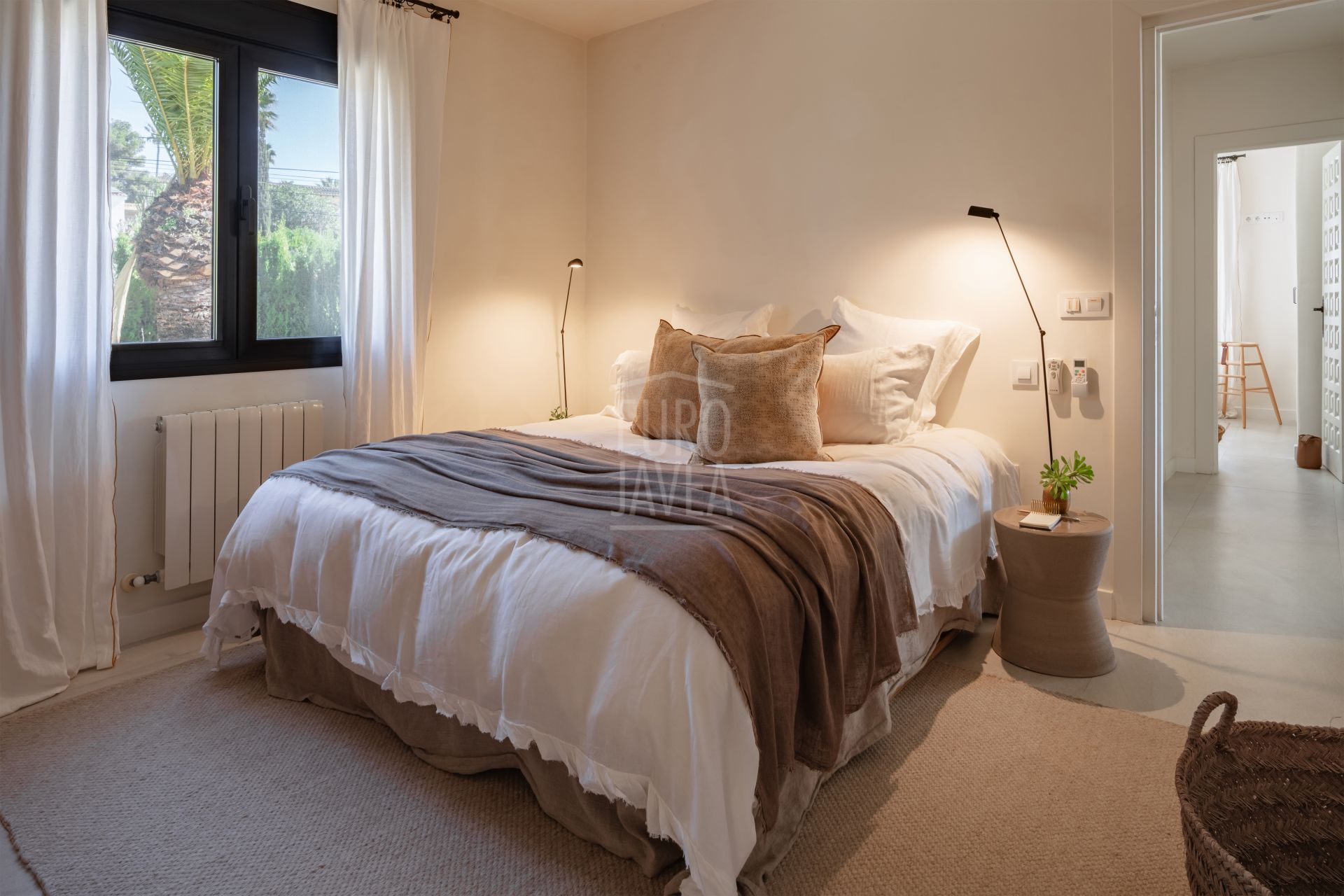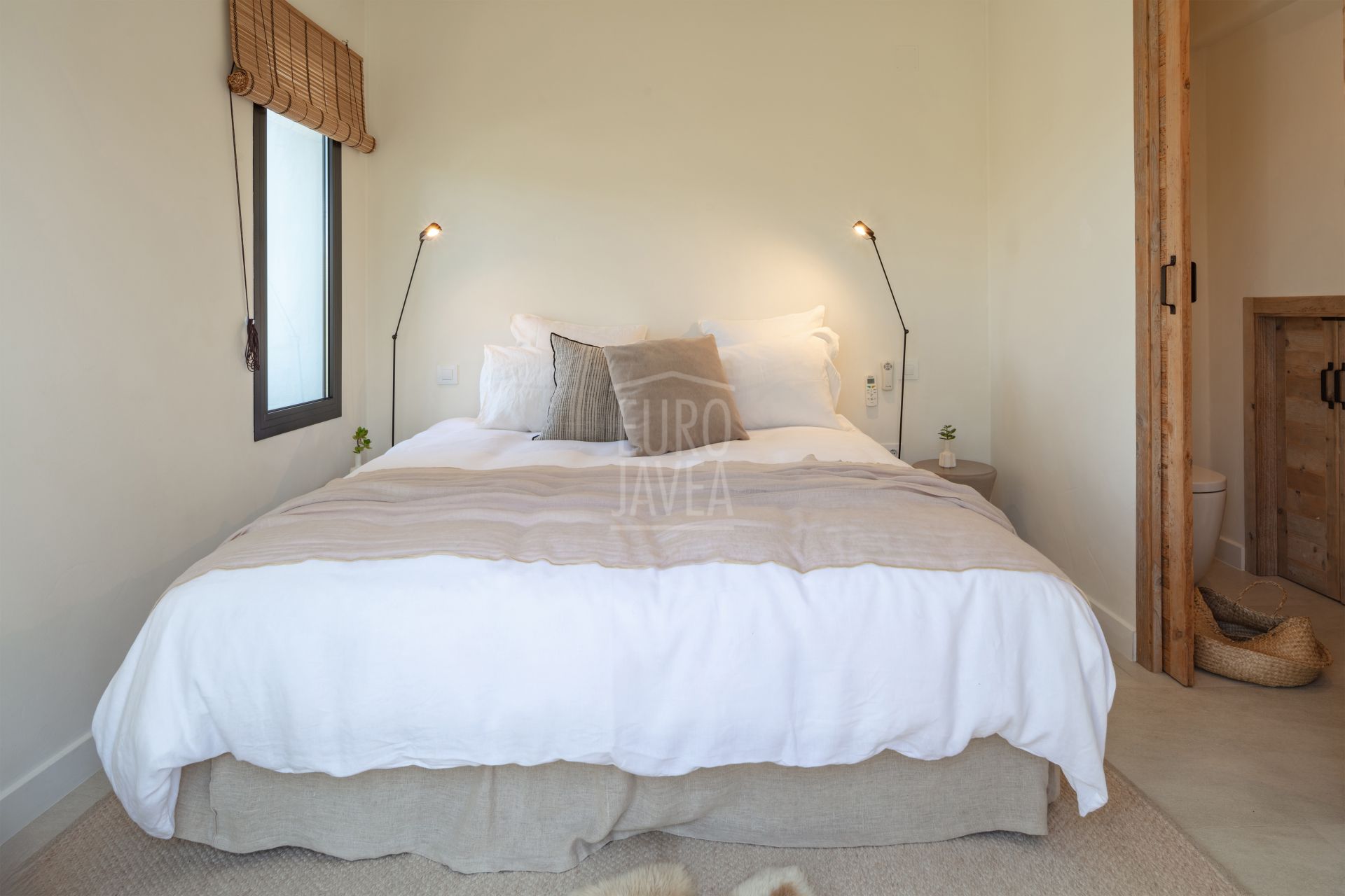 The upper floor is designed as a private level with a generous master suite, featuring an en-suite bathroom and direct access to a spacious terrace. From here, you can enjoy panoramic views over the Mediterranean Sea and the surrounding area, including the distinctive Montgó. Additionally, the villa features a separate solarium, ideal for relaxing in peace and making the most of the views and the Mediterranean climate.