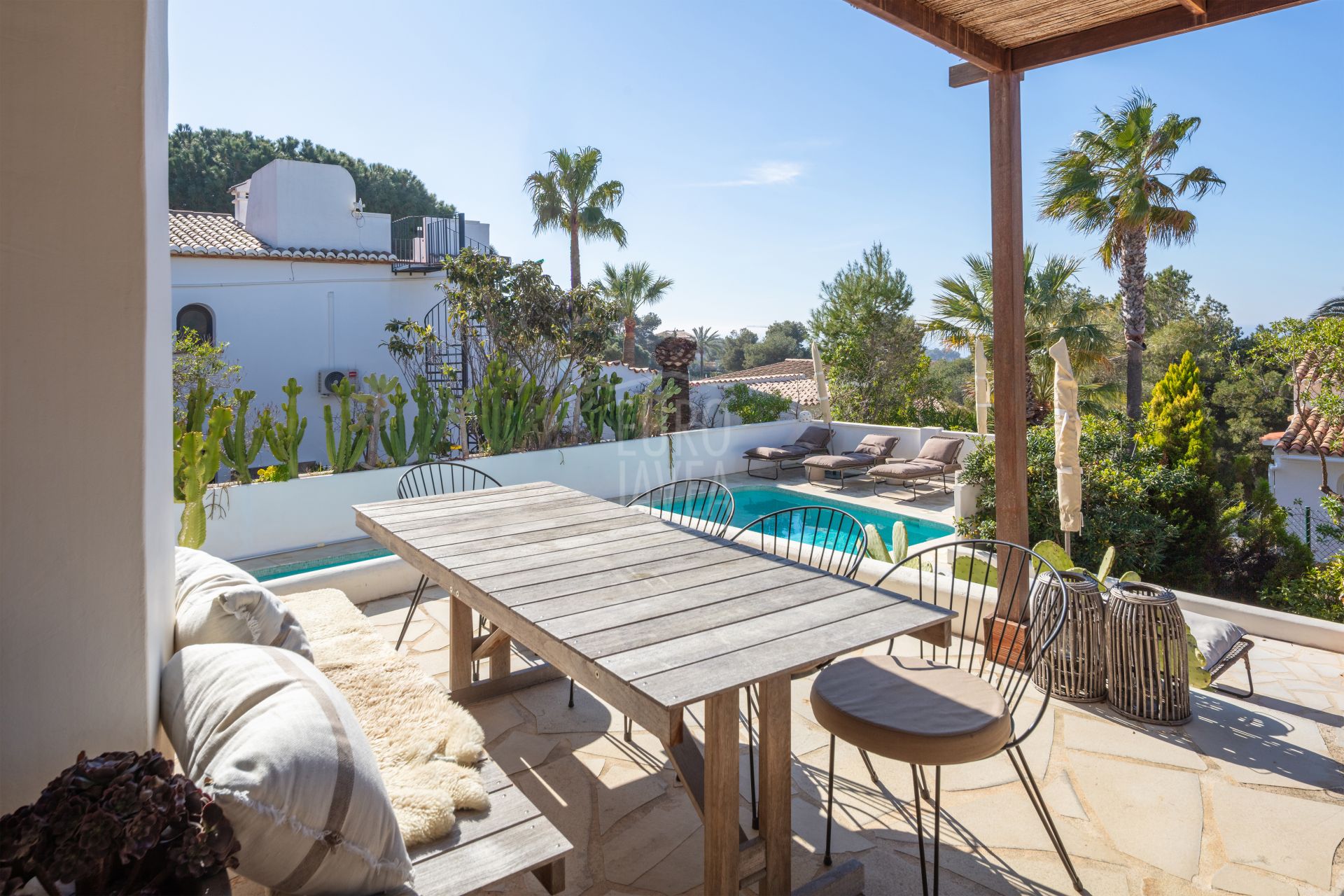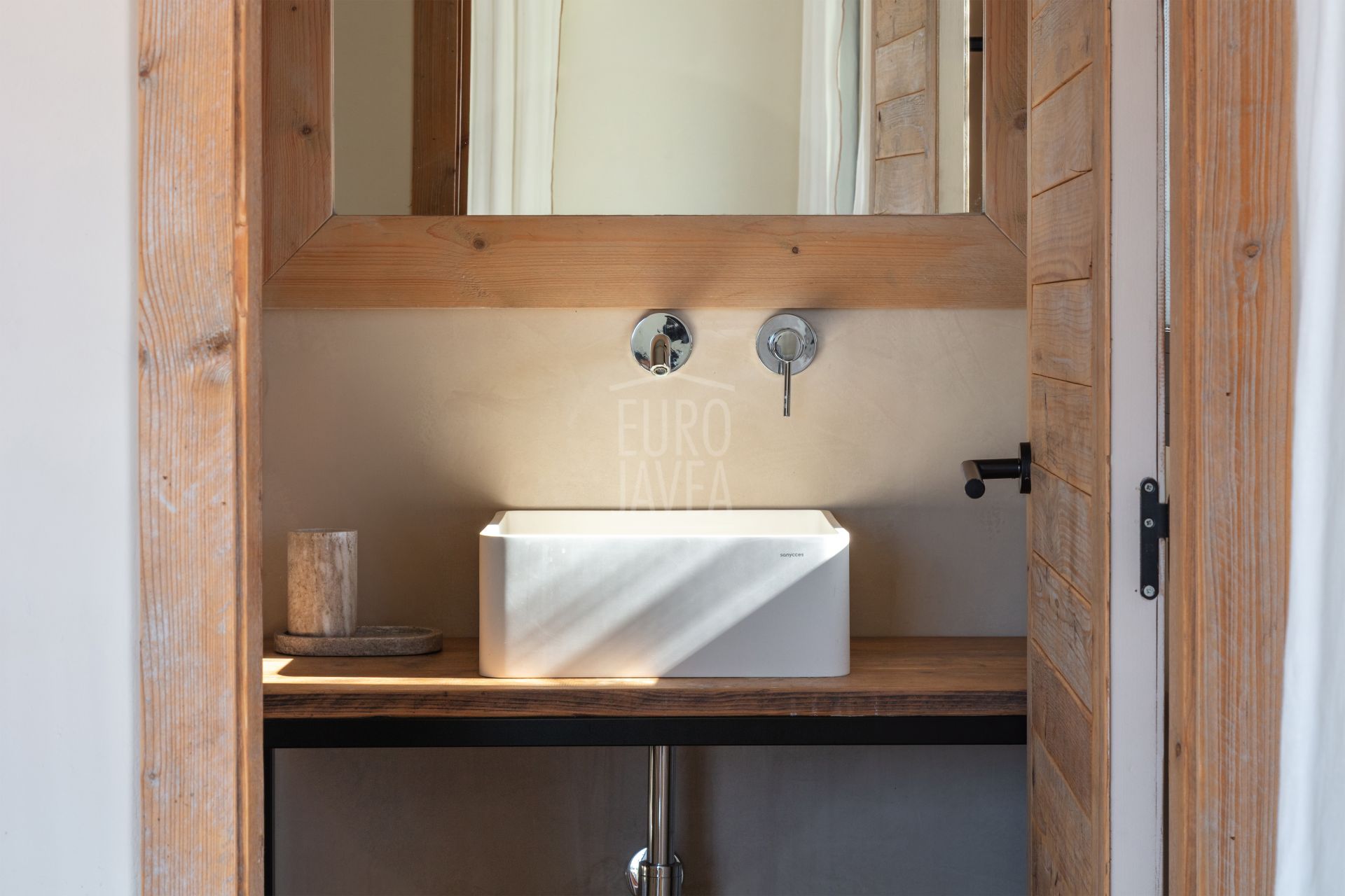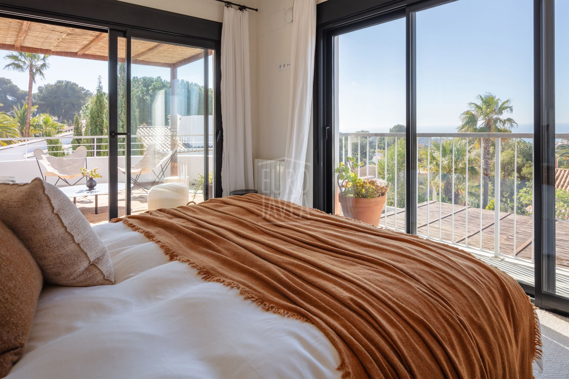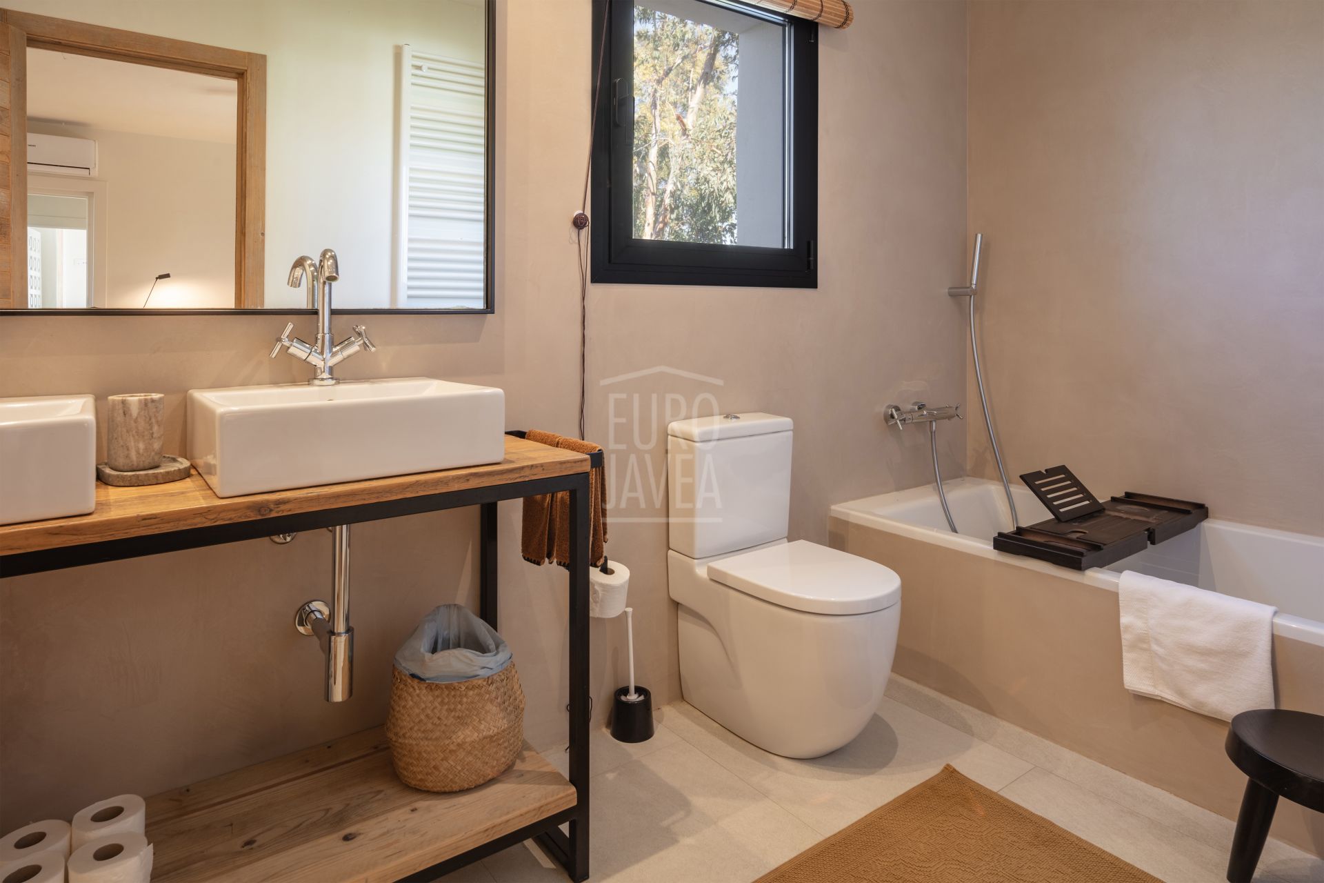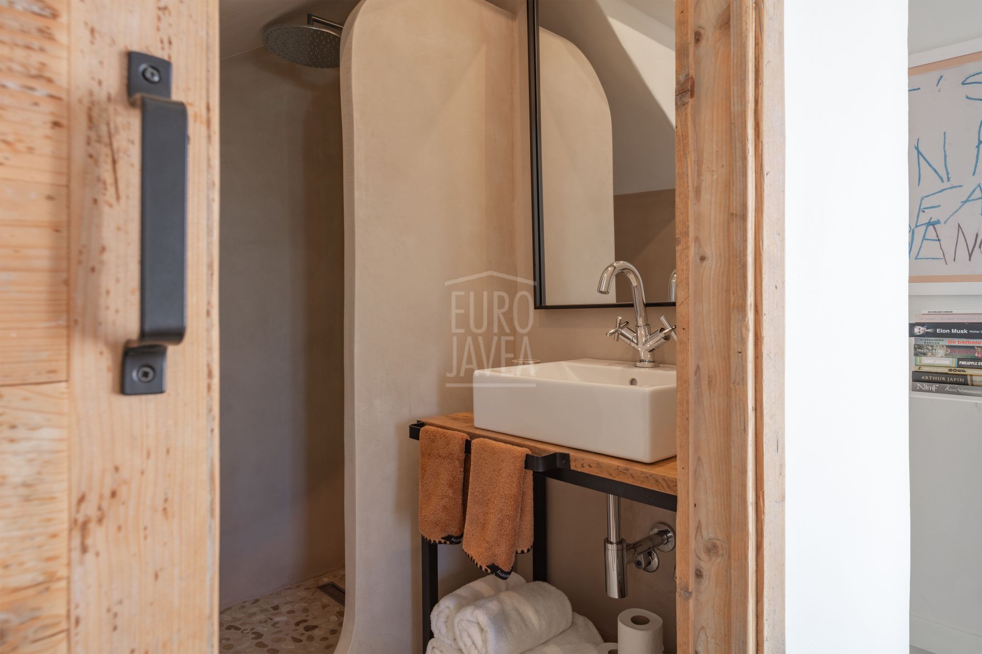 The upper floor is designed as a private level with a generous master suite, featuring an en-suite bathroom and direct access to a spacious terrace. From here, you can enjoy panoramic views over the Mediterranean Sea and the surrounding area, including the distinctive Montgó. Additionally, the villa features a separate solarium, ideal for relaxing in peace and making the most of the views and the Mediterranean climate.