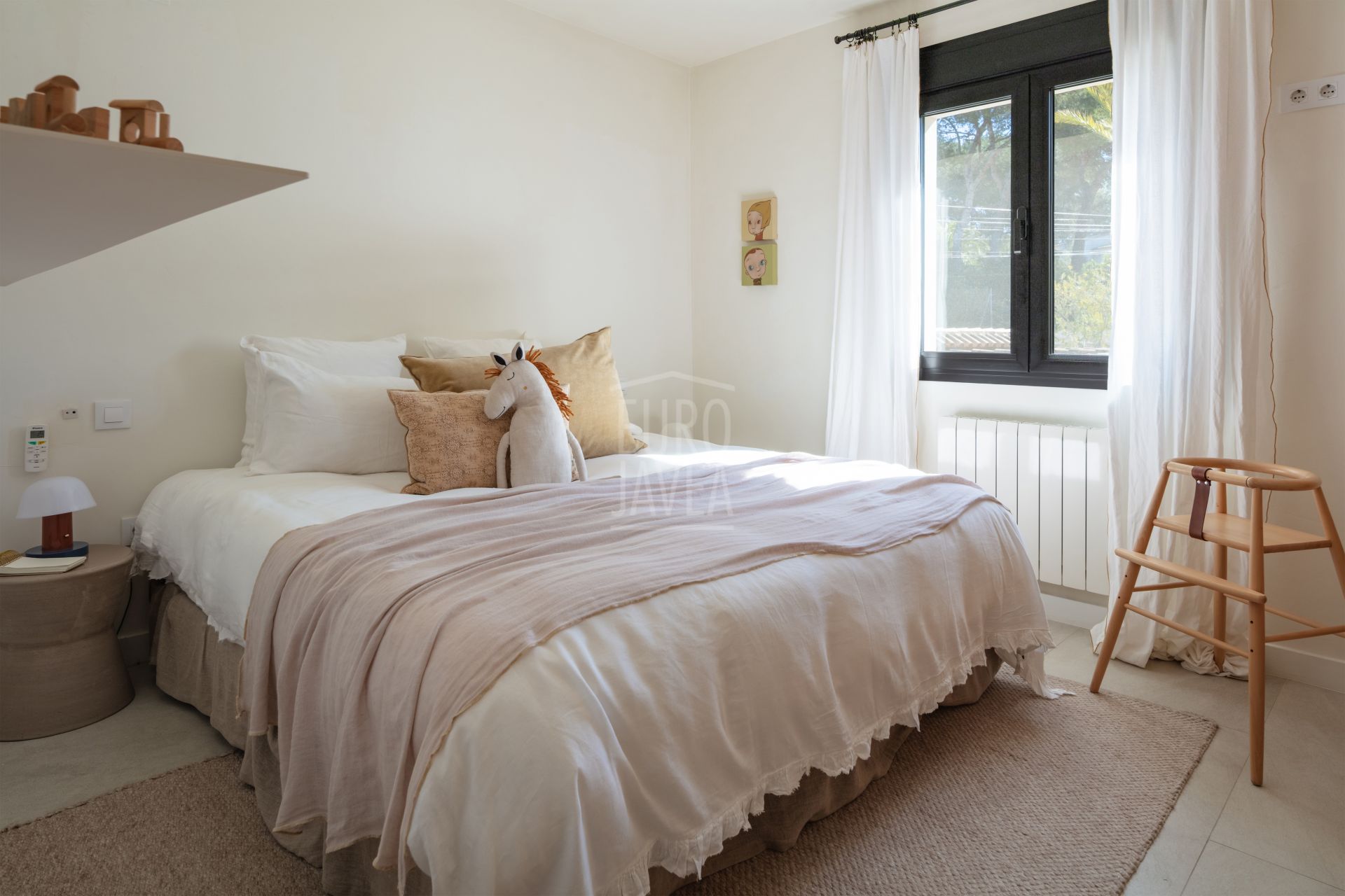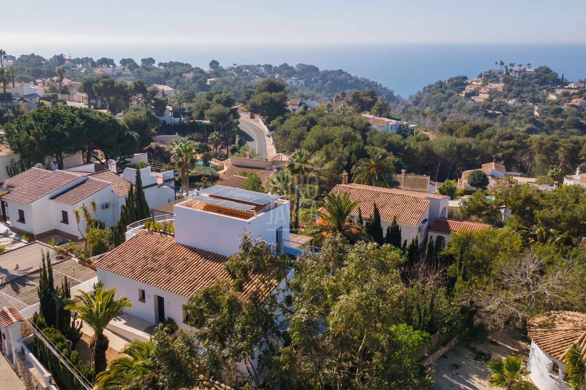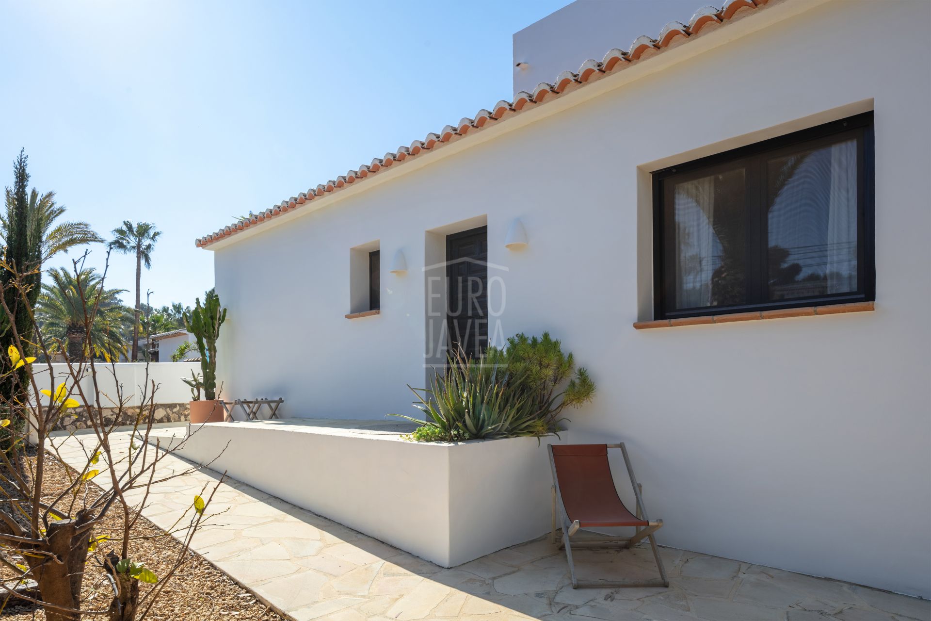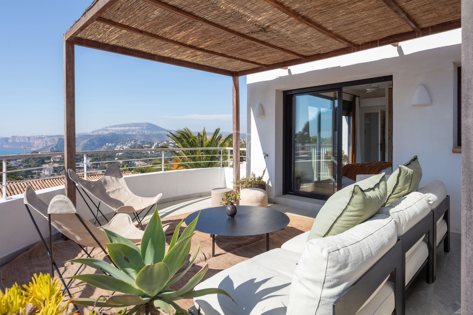 The upper floor is designed as a private level with a generous master suite, featuring an en-suite bathroom and direct access to a spacious terrace. From here, you can enjoy panoramic views over the Mediterranean Sea and the surrounding area, including the distinctive Montgó. Additionally, the villa features a separate solarium, ideal for relaxing in peace and making the most of the views and the Mediterranean climate.