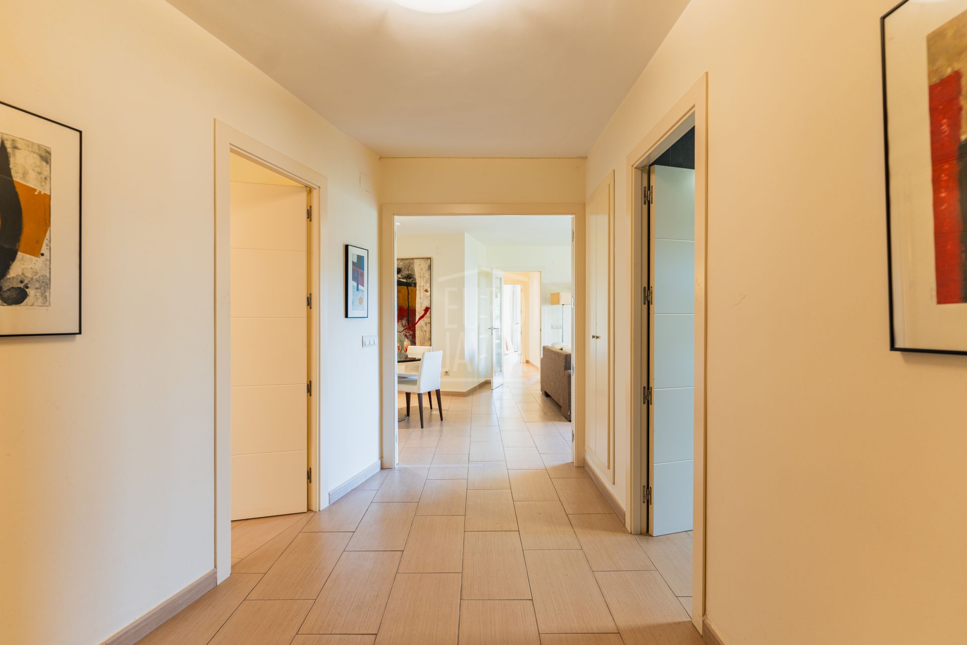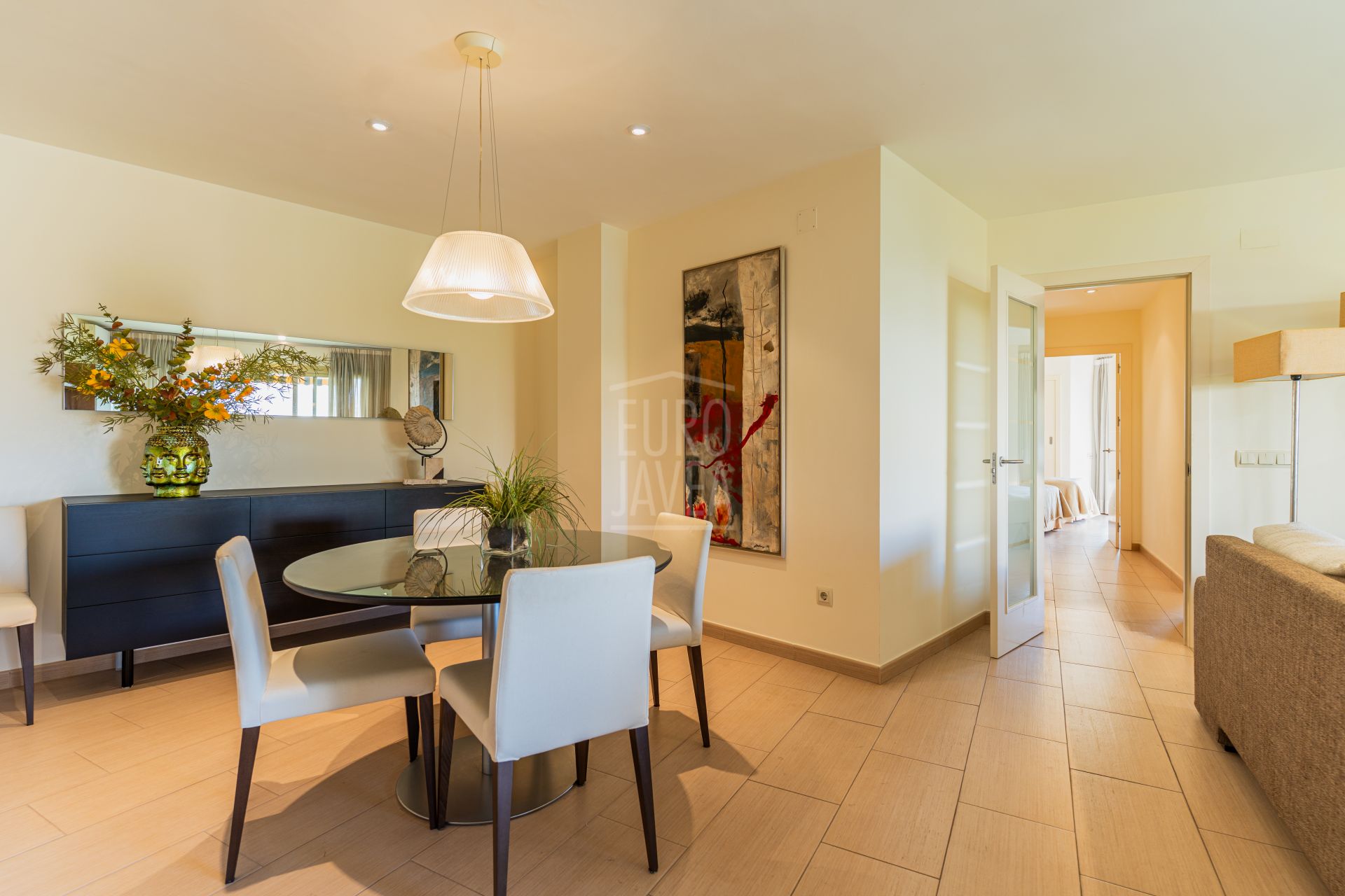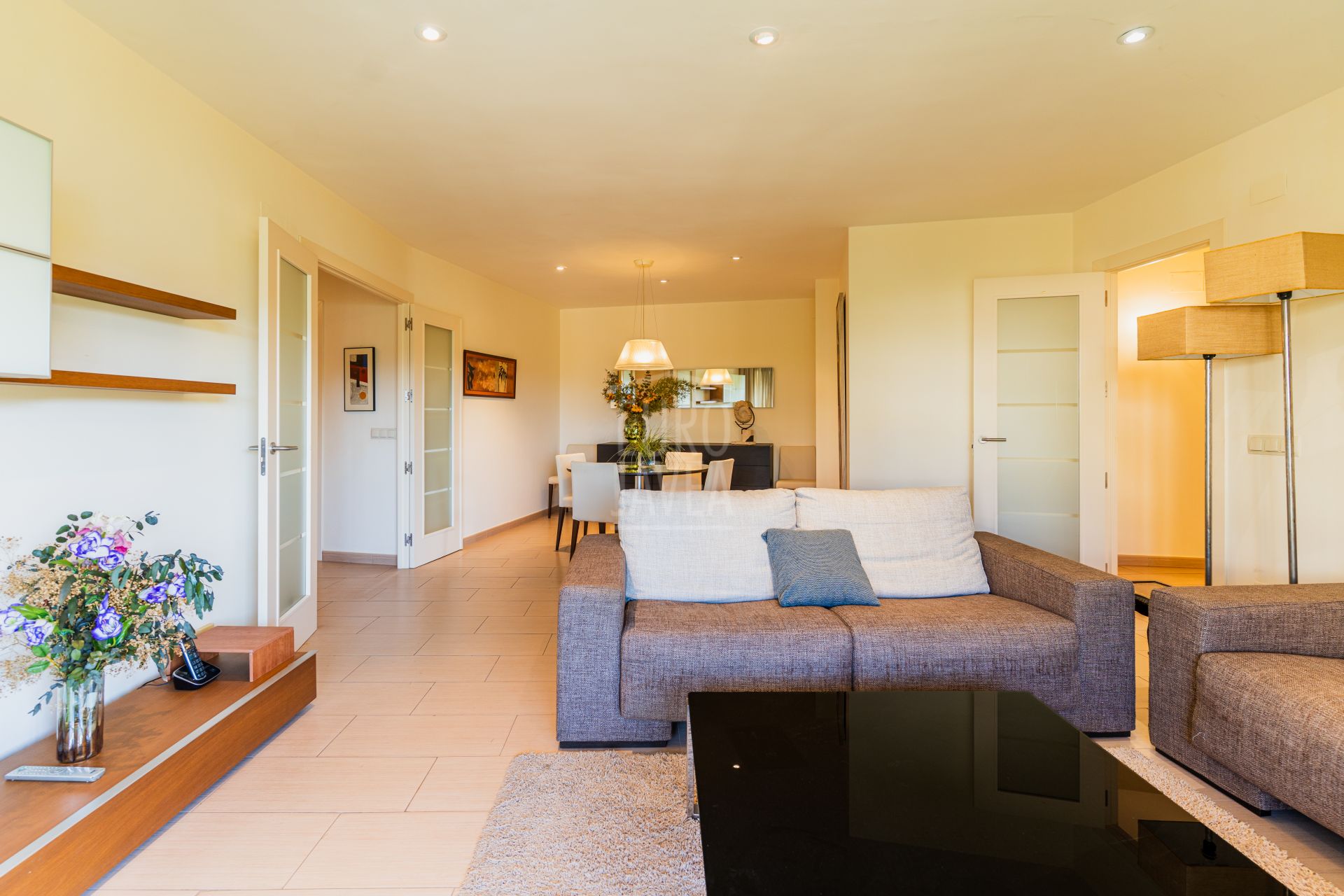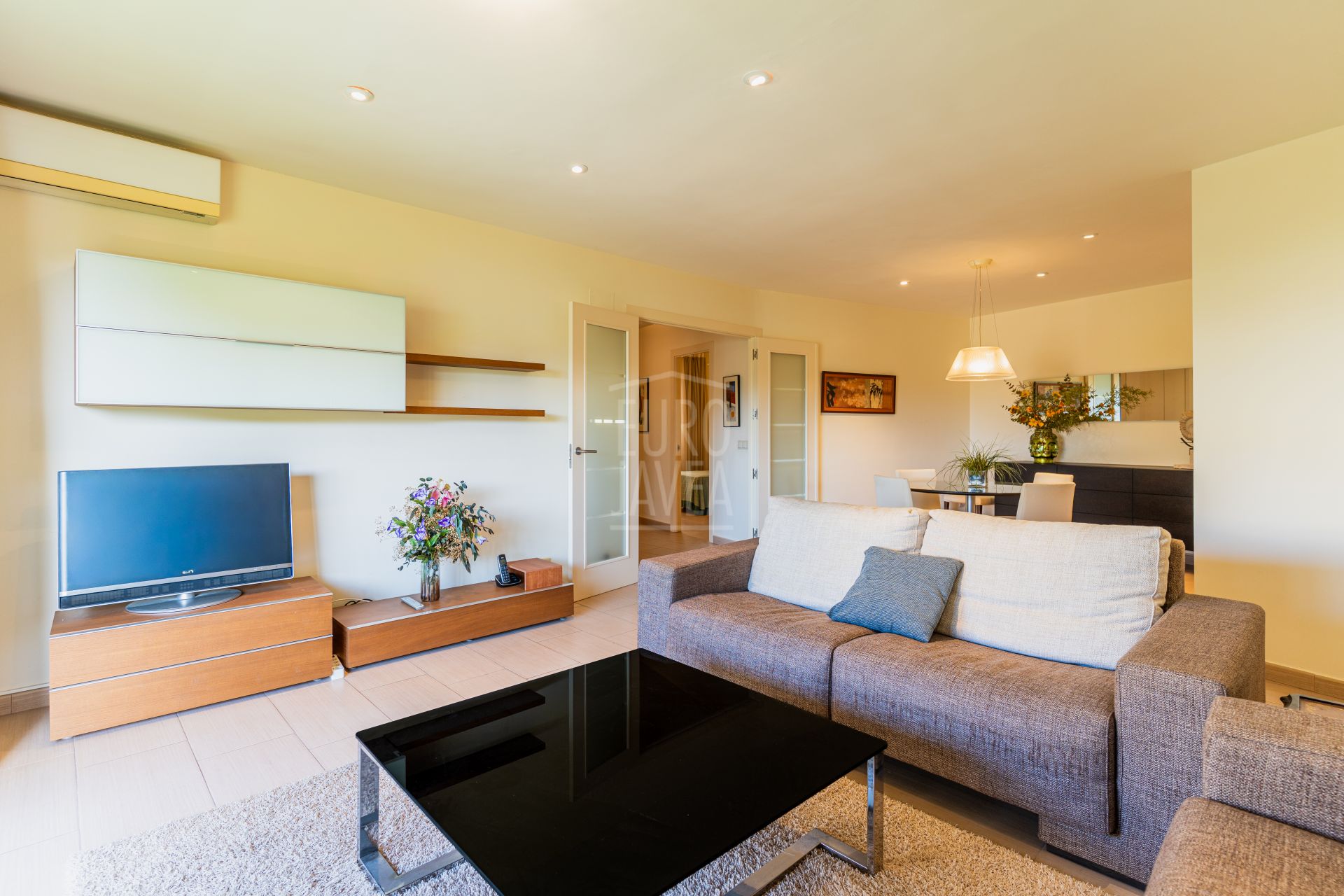 The residence is laid out with a spacious living room and dining area that opens onto a terrace with unobstructed views, a separate kitchen, three bright bedrooms and two modern bathrooms. It also includes a garage space, adding extra convenience. Thanks to its south‑east orientation, the property enjoys excellent sun exposure that fills every room with natural light, creating airy, expansive interiors.