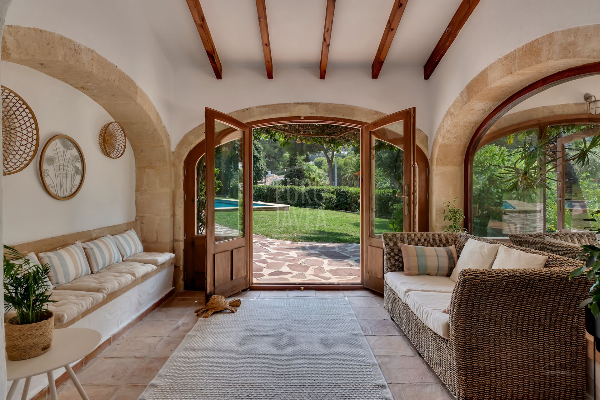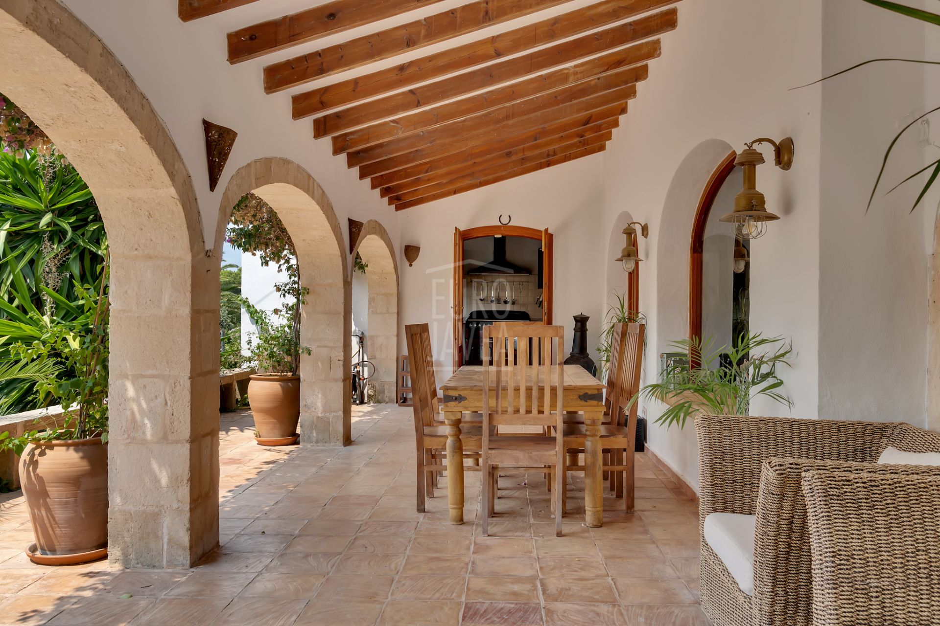 Enjoy this authentic Mediterranean charm in this spectacular traditional villa located in a quiet area of Jávea, just a few minutes from all amenities. The property welcomes visitors with a spacious and inviting naya adorned with elegant Tosca stone arches, handcrafted terracotta floors, and pleasant open views of the natural surroundings. This outdoor space invites you to relax, enjoy the climate, and fully embrace the Mediterranean lifestyle.